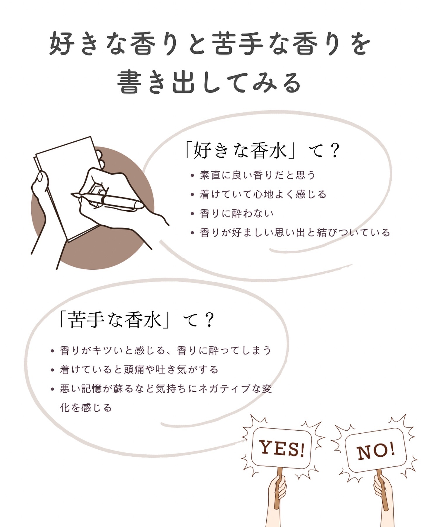 グルマン系が好き!ウッディー系が好き!シトラスが大好き!など系統によって香水の好き嫌いが決まることもあると思うんですが、 好きな香りに絶対含まれるノート「嫌いな香りに絶対含まれるノート」がわかれば、失敗しにくいのでは? ノートを書き出して共通点を探るこの方法を使えば、香水を試しながらその香水に含まれているそれぞれのノートをプロみたいに嗅ぎ分ける必要もないので、初心者さんでも簡単だと思います。