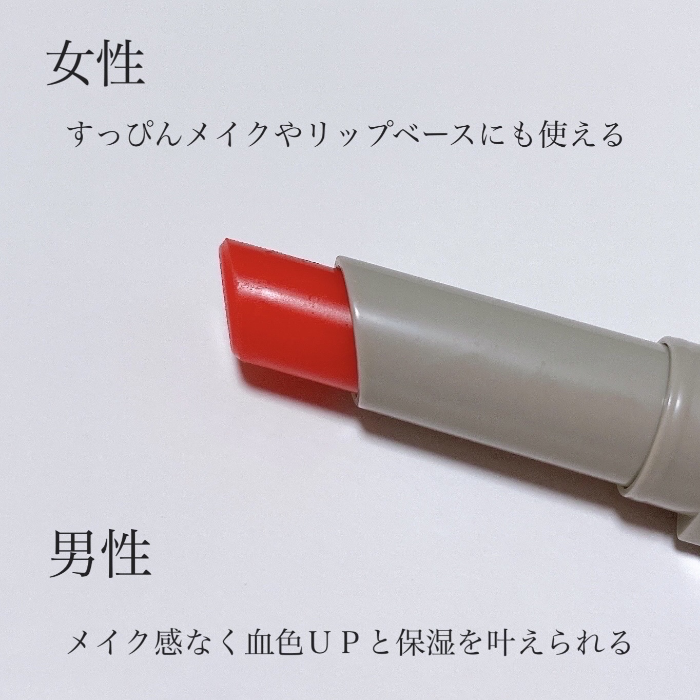 予想していたより、ほんのり血色感という感じ! 潤うのに軽やかなセミマットバーム処方 ほわっと色づくラフな血色感 素の唇をキレイにみせるぼかし効果 パッケージもシンプルでこちらも男女問わず おすすめのポイントだなと感じました。 濃いアイメイクしたときに使用して バランス取るのにいいなと思いました✨