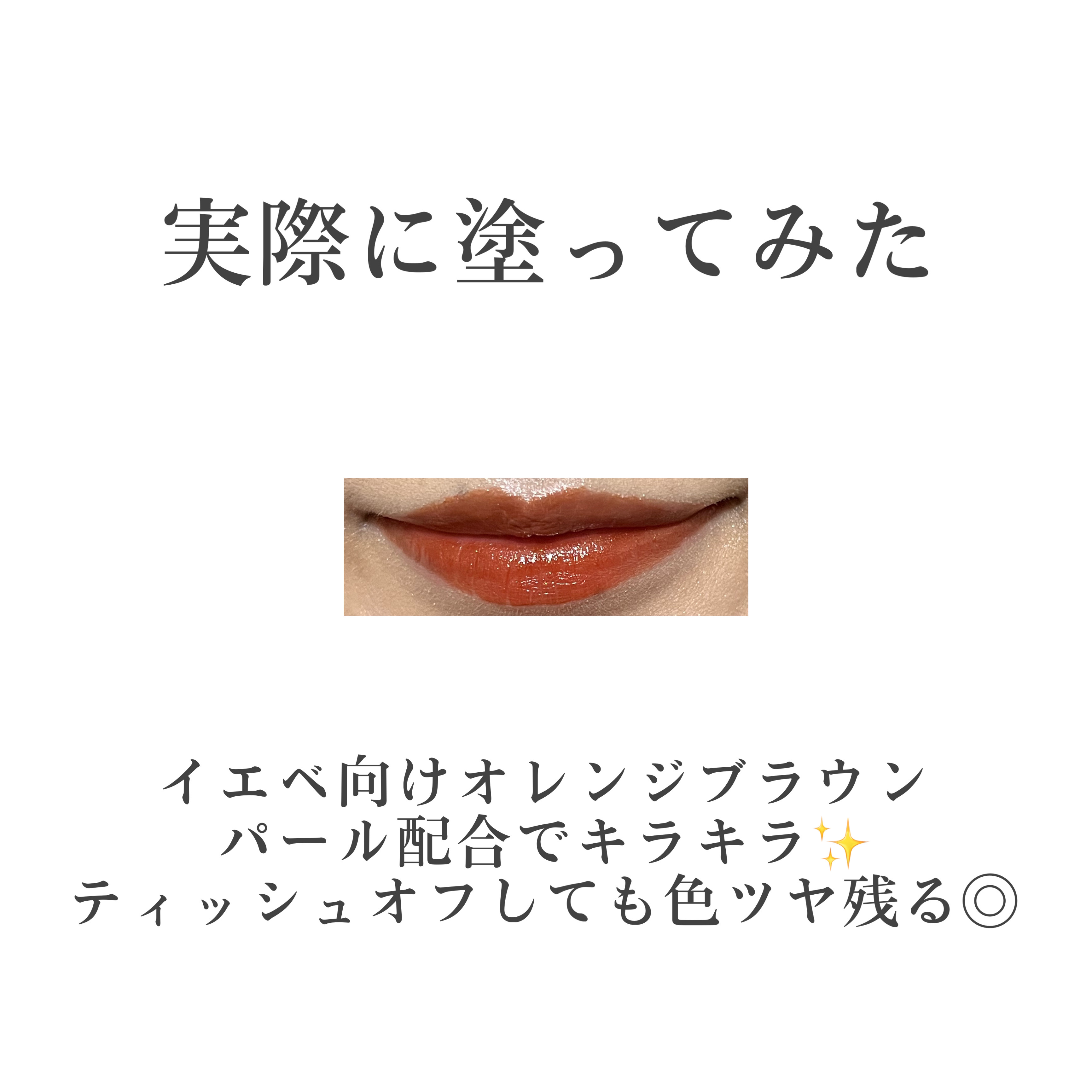 通常より軽めで屈折率の高いオイルを配合しているので、絶妙なツヤ感と美しい光沢感が出るのにベタつきにくく使い心地がめちゃくちゃいいです💗 発色が良く、1度塗りでもしっかり色がつきます!そして落ちづらい✨軽くティッシュオフするとマスク移りも気になりませんでした! 色味はオレンジブラウン系で垢抜けたようなおしゃれな印象にしてくれます!1度塗りだとブラウンよりはオレンジっぽさが強いので夏メイクに、2度塗りだとよりブラウン味が出てくるので秋冬メイクにとほぼオールシーズン使えるリップです🫶