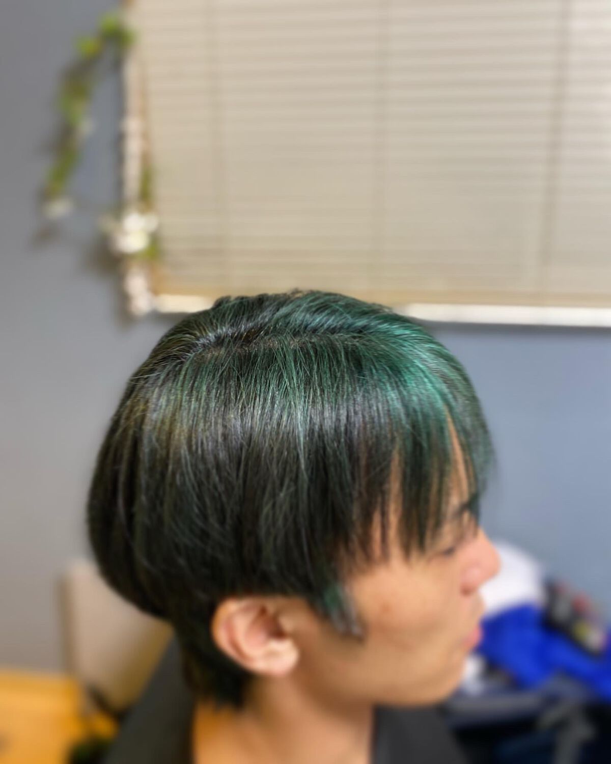 白髪には色は入らないとのことだったのですが ほんのり グリーンに… 😂 本来の使い方は ブリーチした髪に使うのが正しい使い方ですが 白髪につかったらどうなの? と気になっている方の参考になればと思いました😌 黒髪もほんのりグリーン 白髪はシャイニー感が出て メッシュよりもアクセントになって オシャレかも?!と夫は喜んでいます😚