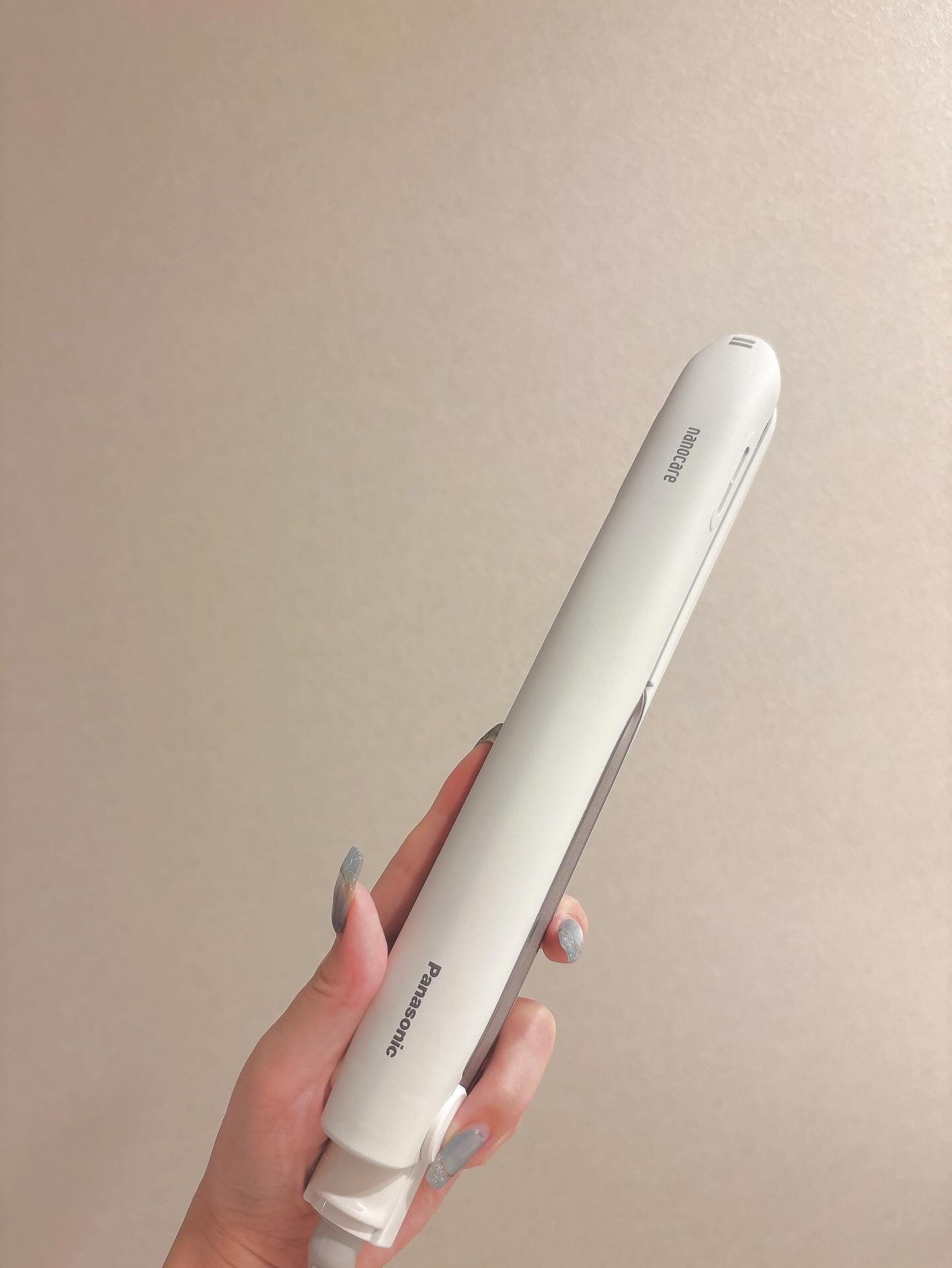 従来品より滑りやすさがUPした3D密着プレートが髪をしっかりとらえて効率よく真っ直ぐに! パナソニックさんならではのナノイー効果でキューティクルケアもできるから、バサバサな私の髪も毛先までしっとり! 表面のパヤパヤ髪もおさったよ✨ ボタンが内側にあるから使ってる時にうっかり押しちゃったりしない事と、20秒で温まるから忙しい時でもサッと使えるのは嬉しい◎