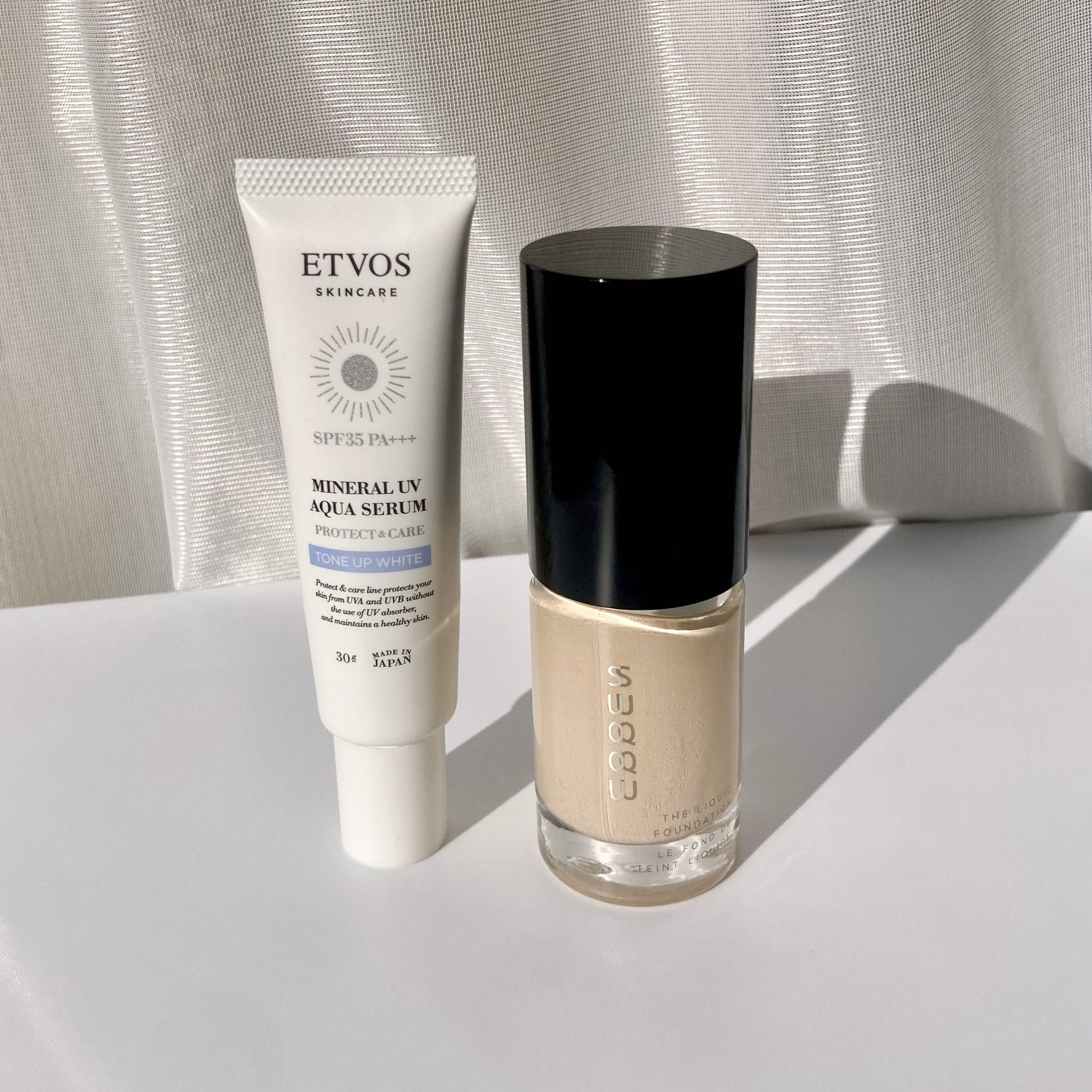 やっぱりSUQQUのザリクイドはやっぱりツヤ感が綺麗ですき🥺 塗りたてがザ リクイド ファンデーション綺麗なのはもちろんなんだけど、夕方の肌の状態がすごい ボツボツと毛穴に落ちてくる感じや、ファンデがヨレる感じもなく、崩れ方が綺麗ってこういう事か…!と初めて思わせてくれたファンデーション ただひとつ難点があります、、 タッチアップしてもらって1番明るいカラーを買ったんだけど、それでもやっぱり黄みが強い😭 ETOVOSのトーンアップ下地と併せてもこんな感じ ナチュラルな肌に見せたい時は◎ ETOVOSの下地はどんなファンデとも合わせやすいので使いがち😙 SUQQUのファンデで明るめのニュートラルなカラーが出て欲しいなぁと願いつつ(出来ればほんのりらピンク系) この組み合わせを試行錯誤してその日なりたい肌に合わせてベースメイクを使い分けてるよ🙆♀️