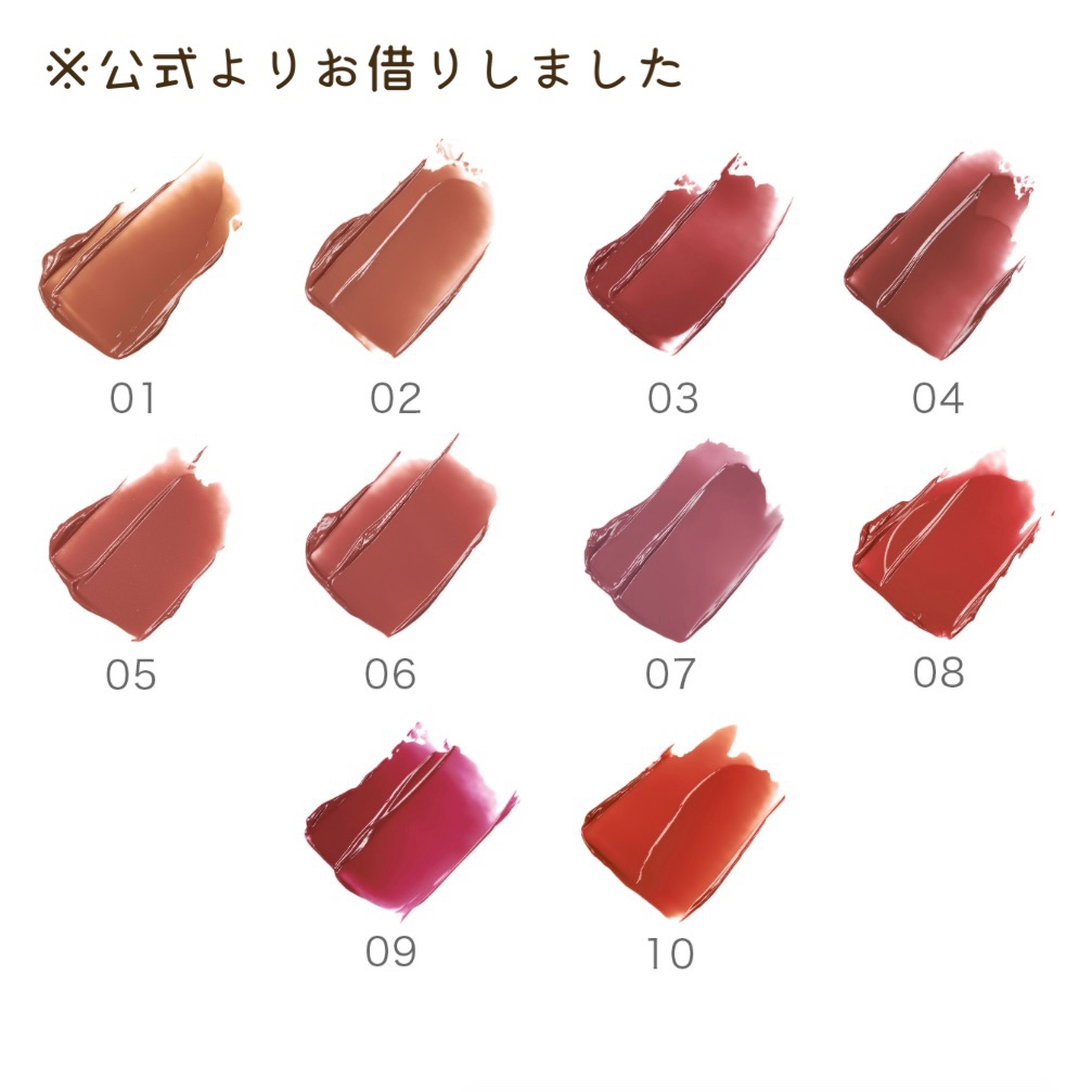 まず、塗り心地がとても良い!! 透け感があってグロスほどツヤツヤではないものの ツヤ感があってとても可愛いです❤️ ティントではないので、色持ちは良いとは言えないのですが、個人的には最初に何度か塗り重ねるとそこまで落ちは気にならなかったです! 私は少し明るめに発色するみたいで、03はレッドブラウンなのですが、そこまで暗くならずオールシーズン使えるかな?と思いこの色にしました。