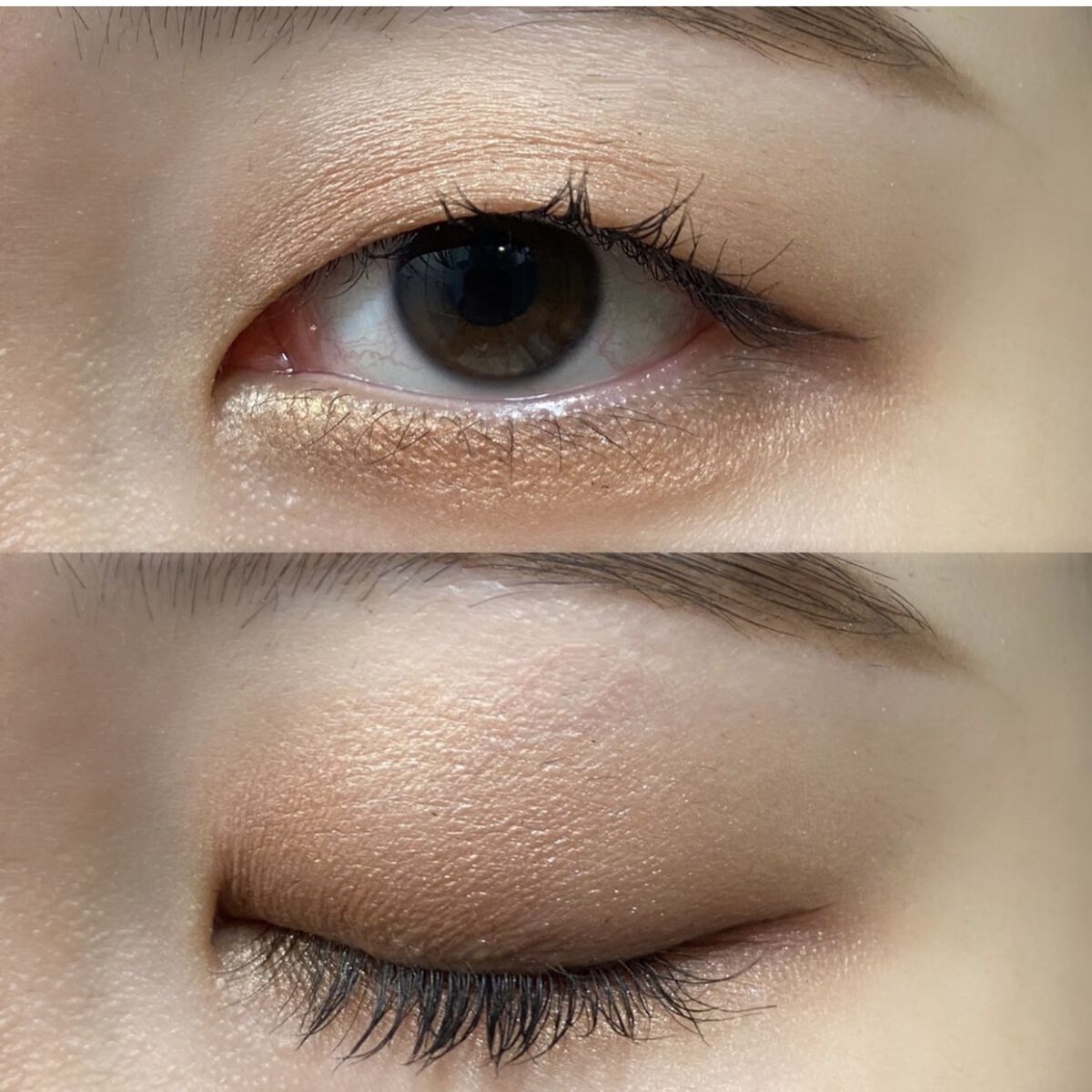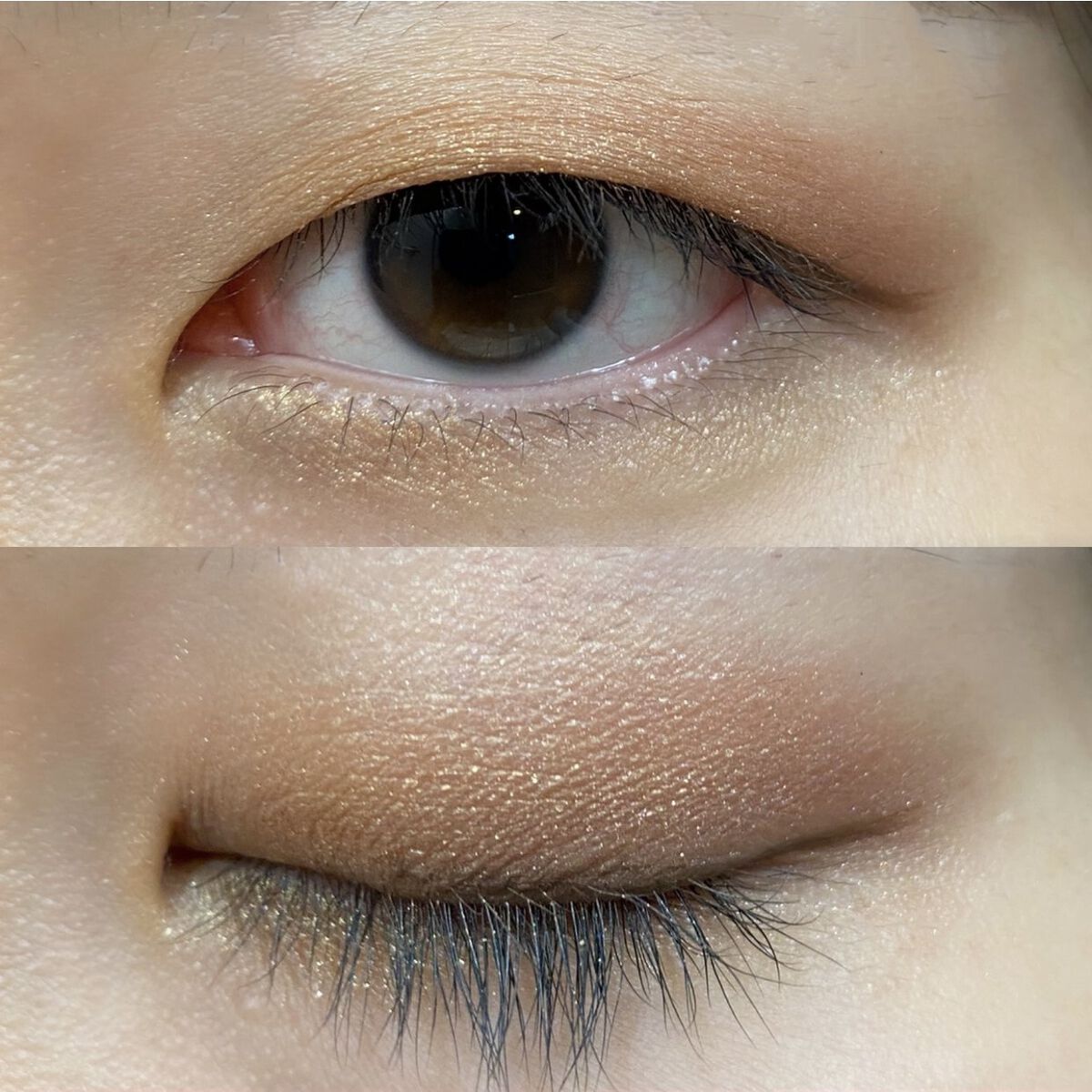 【良いところ】・捨て色なし・ゴールドのラメとカラーがしっかりしている・他3色はツヤ感が出る・ラメ落ちしにくい・ぼかしやすい 【イマイチなところ】・透け感発色?だからがっつり色味を出したい場合は下地が必要・擦れに弱い 【どんな人におすすめ?】オレンジ系のカラーが好きな人、ラメが好きな人、どちらかと言えばイエベ向き? 【使い方】今回はパッケージ裏面のオススメのやり方で塗ってみました🫶①左上のカラーをアイホールに塗る。②左下のカラーを目尻に塗る。③右下のカラーを二重幅より狭めに、キワに塗る。④右上のカラーをまぶた中央と涙袋に塗る。公式オススメなだけあって4色全ての良さが出る塗り方でした😍