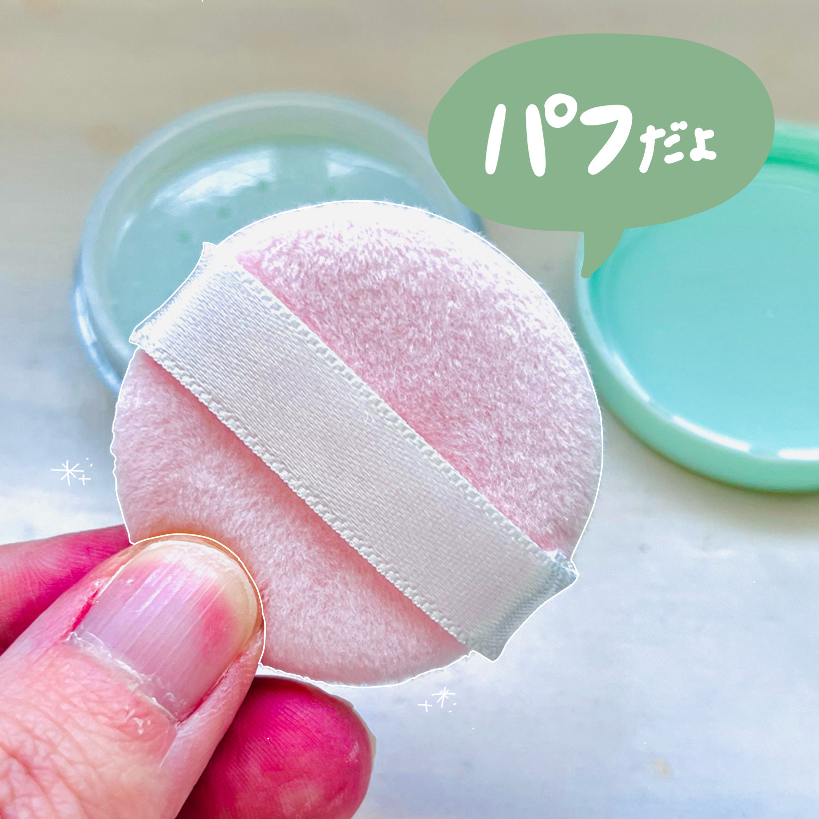 サイズが分かるように並べた写真は見た事がなかったので正直騙された感が否めない…。 スキンケア後のクリームのベタつきを抑える為に買ったんですが、これならデカいベビーパウダー買った方が安上がりなので、メイク関係なくとりあえずベタつきを何とかしたい!って方はベビーパウダー買った方がいいです。 でも、上手く使えればサラサラ感はベビーパウダーより持続します。 あと、これ重要なんですが、クリーム等の上から重ねた時、ちょっとでも擦ると粉がクリームと混ざったカスがボロボロ落ちて汚くなるので、毎回慎重にパタパタしないといけません。 極小パフに取って何度もパタパタしないといけないのは面倒なので、(粉飛びが酷いのでおすすめはしませんが)私は以前Seriaで購入した「スポンジ付パウダーポット」に詰め替えて使う事にしました。