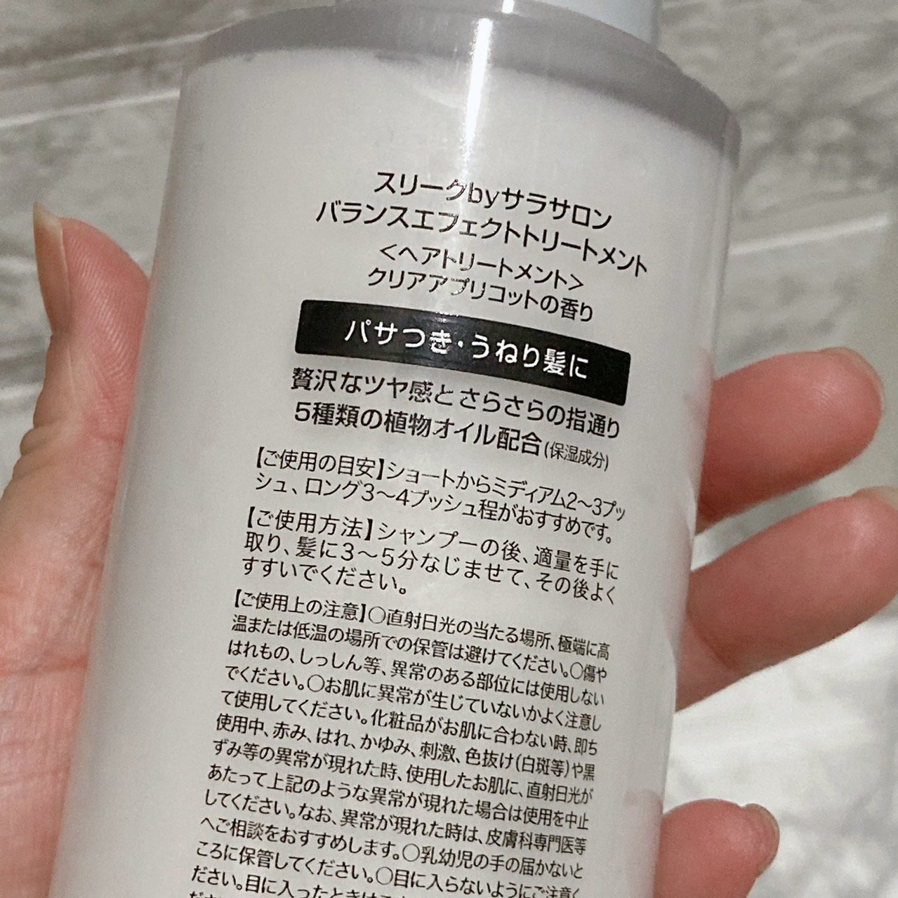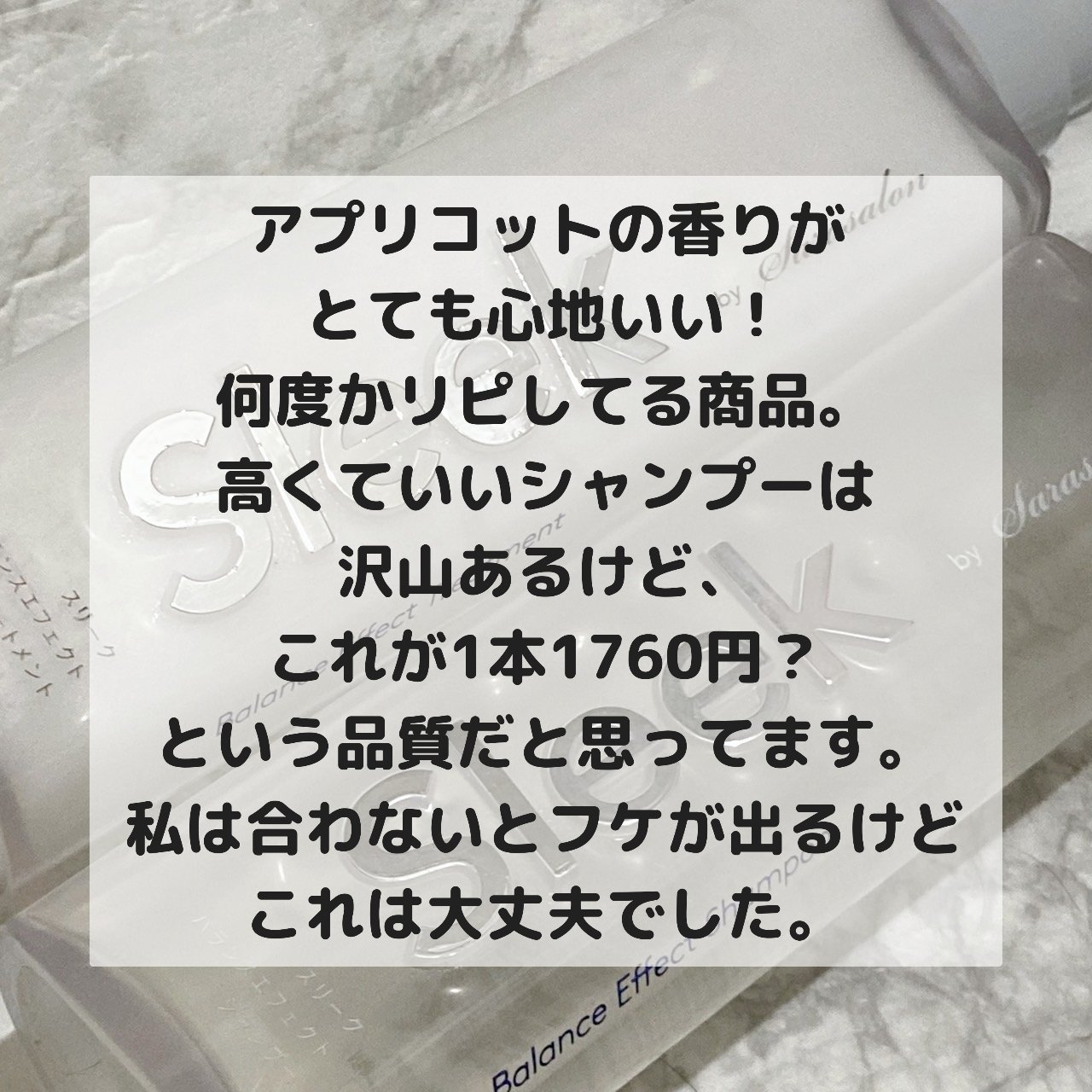 ドライヤーで乾かした後の写真あり📸スリークbyサラサロンバランスエフェクトシャンプー/トリートメント何度かリピしてる商品です。クリアアプリコットの香りは洗ってる時もふわっと香ってきて癒されます。きしみを感じず洗えるのでおすすめ。売ってる店舗がまだ少ない印象なので、Amazonや楽天、アットコスメから買っています。最近髪の調子がいいので今度他の商品も紹介したいのですが、これを使ってるのも理由の一つだと思います。#冬のうるツヤ髪メンテ#ヘアケア#おすすめヘアケア#スリーク