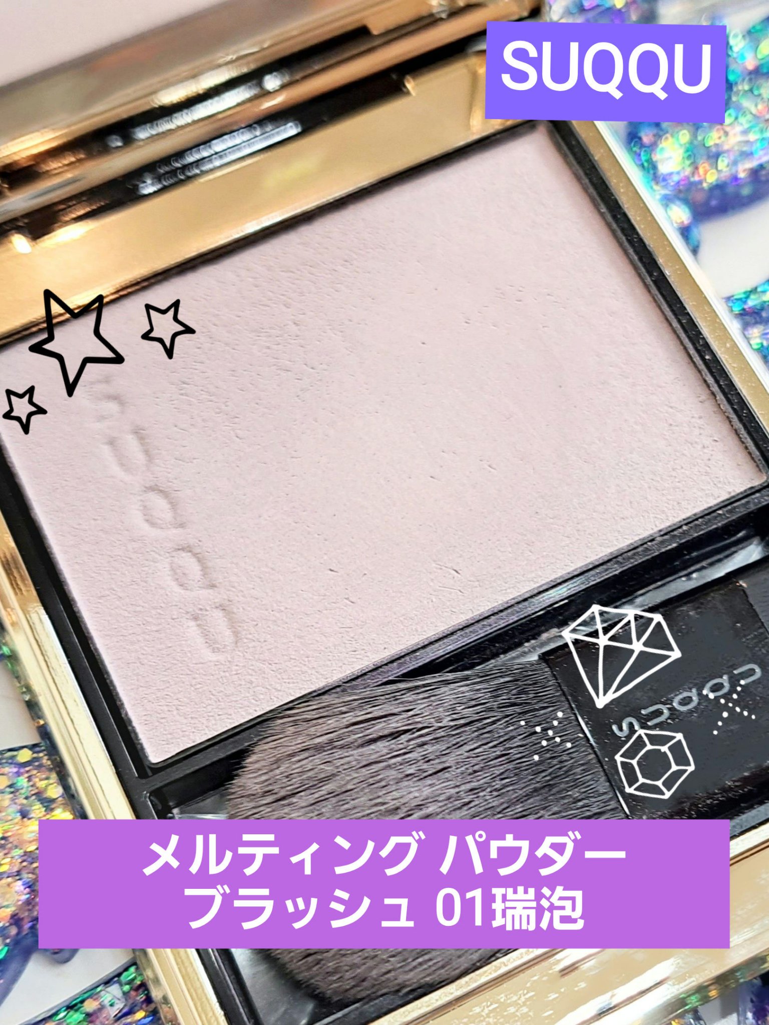 SUQQUメルティングパウダーブラッシュ01瑞泡。人気でずっと手に入らず、やっと入荷した矢先に2度と買えなくなると聞いてショックを受けたコスメ。◎特徴①オイル配合のチーク。しっとりツヤっとします。②01瑞泡は紫色のチークで透明感が出ます。ハイライトのように使ってもいいかも。③粉質が細かく肌にフィット△気になった点①2度と買えない。メルティングパウダーブラッシュシリーズ、原料の都合で廃盤だそうです。