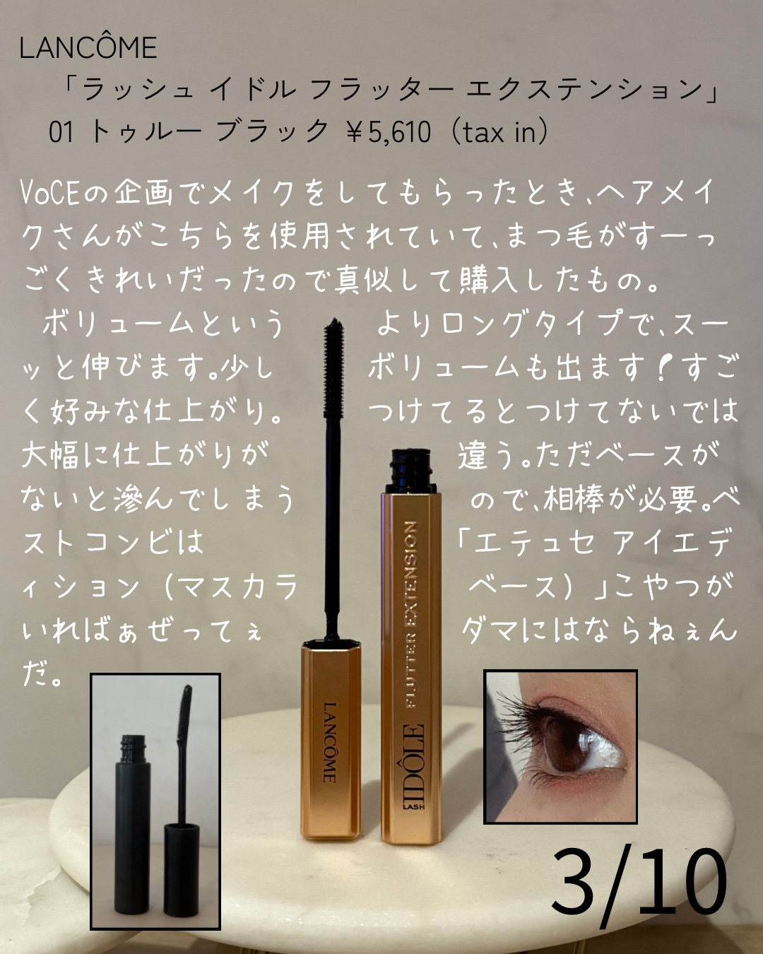 マイベスコス2025上半期今現在、発売されているものの中でのエランのベストコスメです!スキンケア、メイク合わせて10アイテム選んでみました🥇🥈🥉①IPSA 「アイブロウクリエイティブパレット」 02ブライトスパイス【数量限定】 限定色全2種展開各¥4,950(taxin) これが大人気な理由がわかりました。この値段でもみんなが買う理由がわかりました。もう買ってからずーーーーっとコレ一択。 ムラなしふわふわ眉に仕上がります。 ふわふわにする左上が早めに無くなってしまいそうな所以外完璧!------------------②コスメデコルテ 「コスメデコルテルージュデコルテクリームグロウ」全25色各¥5,500(taxin) 各媒体でも多数受賞していたこちらのアイテム。もう25色全てがいい色。肌の延長線上にある色展開らしいです。だから欠点は選べないこと!笑 クリームの質感がとろけて唇の上をスーッとすべるような塗り心地がたまらなくて、塗るたびに癒されます。私のお気に入りは24Gなのですが「透明感のあるベージュブラウン」どんなシーンにも合う最高のリップです。 もう少し明るい色も買い足したいのですが、選べない。笑------------------③LANCÔME 「ラッシュイドルフラッターエクステンション」 01トゥルーブラック¥5,610(taxin) VoCEの企画でメイクをしてもらったとき、ヘアメイクさんがこちらを使用されていて、まつ毛がすーっごくきれいだったので真似して購入したもの👀✨ ボリュームというよりロングタイプで、スーッと伸びます。少しボリュームも出ます!すごく好みな仕上がり。つけてるとつけてないでは大幅に仕上がりが違う。 ただベースがないと滲んでしまうので、相棒が必要。ベストコンビは「エテュセアイエディション(マスカラベース)」こやつがいればぁぜってぇダマにはならねぇんだ。------------------④FAS 「FASザブラックデイクリーム」 【医薬部外品】SPF50+/PA++++ 40g¥6,600(taxin) なんかつい手に取ってしまう気持ちの良いクリーム。そしてエイジングケア*もできてしまうから余計に使いたい気持ちが溢れてつい手にとってしまう。そう「つい手にとってしまうNo.1」なのです。 しっとりするのにどんなアイテムとも相性が良く、静かな優等生という感じ。 各媒体でもたくさんベスコスに選ばれていました!みんなつい手にとってしまうんだろな!笑------------------⑤M•A•C 「MACカラーエクセスジェルペンシル」 スキップザウェイトリスト 全19色各¥4,070(taxin) ゴールデンブラウンシマーというカラー。焦茶でラメ入り。茶目さんにオススメしたいカラー。黒のアイライナーは浮く、でも目力は欲しい。でもなんかくっきりは似合わない。。。と頭を抱えるミドサー茶目仲間がいたら購入をおすすめします。 発色が良いのでスルッと描ける。ウォータープルーフで滲んでこない。色移りもしません←個人的に結構重要ポイント。 他の色も欲しくなる。------------------⑥REVLON 「レブロンダズルアイシャドウクアッド」 003VINTAGEROSE 全15色展開??各¥1,430〜¥1,540(taxin) こちらはパーソナルカラー診断と顔診断をしてもらった方のところにテスターであって、かわいすぎて購入!(@katsumiさんありがとう♡) これをつけてると「今日のアイシャドウどこ?」と聞かれる率が高い!「似合ってる」と言われることも。そして、使っていて嬉しいのが二重に溜まらないandくすまないand時間が経ってもキレイ/プチプラなのにここまでテンションをあげてくれるのはわたしにめちゃくちゃあってるんだろうなと相性の良さをかみしめてめす♡笑 あまりに好きなので他の色も購入予定!------------------⑦DiorBeauty 「ディオールスキンフォーエバーグロウルミナイザー」004コーラルグロウ ¥8,580(taxin) 透け感とツヤの天才。どんなメイクにも合う天才。イエベでもブルベでも溶け込む天才。とりあえず天才! この透けツヤ感の美しさはザ・デパコスクオリティ。これぞデパコスクオリティ。使う度に美しさに興奮です。でもパケが可愛すぎて汚したくなくて持ち歩けないの。笑 防水スプレーとかするべき?------------------⑧episteme/エピステーム 「ポアリニューイングショット」 50ml¥8,800(taxin) VoCE2025年上半期ベストコスメ先行美容液部門4位にもランクインしてました。毛穴ケアの美容液。毛穴ケアといえば、「肌の引き締め→毛穴も引き締まる」、「ハリを出す→毛穴を目立たなくする」、「角栓の洗浄」が定番だと思うのですが(定番ももちろん大事!)でも、これやり尽くした人いませんかー??!もう化粧品ではダメなのかなぁって。。。 そんな人にとりあえず使ってみてほしい、毛穴の根本にアプローチする新しい作用機序のアイテムなんです!ハイフしたときの肌に何が起こっているのか研究し、その作用を起こすために必要な成分を配合したそう。 いつも毛穴を埋める系ベースを必ず使っていたのですが最近忘れてる自分がいます。まだ一本目なのでこちらも使い続けてみたいと思います。いや、マニアとしては一度やめてみるべきか?笑------------------⑨MARVESARA/マーべセラー 