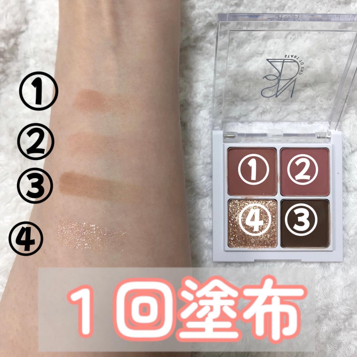 捨て色のない4色パレットでメイク初心者でも簡単にアイメイクを楽しめる しっとりタイプのテクスチャーなので、ブラシより指やチップで塗ると鮮やかに発色 密着感があるのでラメ飛びしにくいです。 マット系は薄づきなのにラメは結構つくので、マット系の勢いでつけてしまうとつけすぎちゃうので注意⚠️