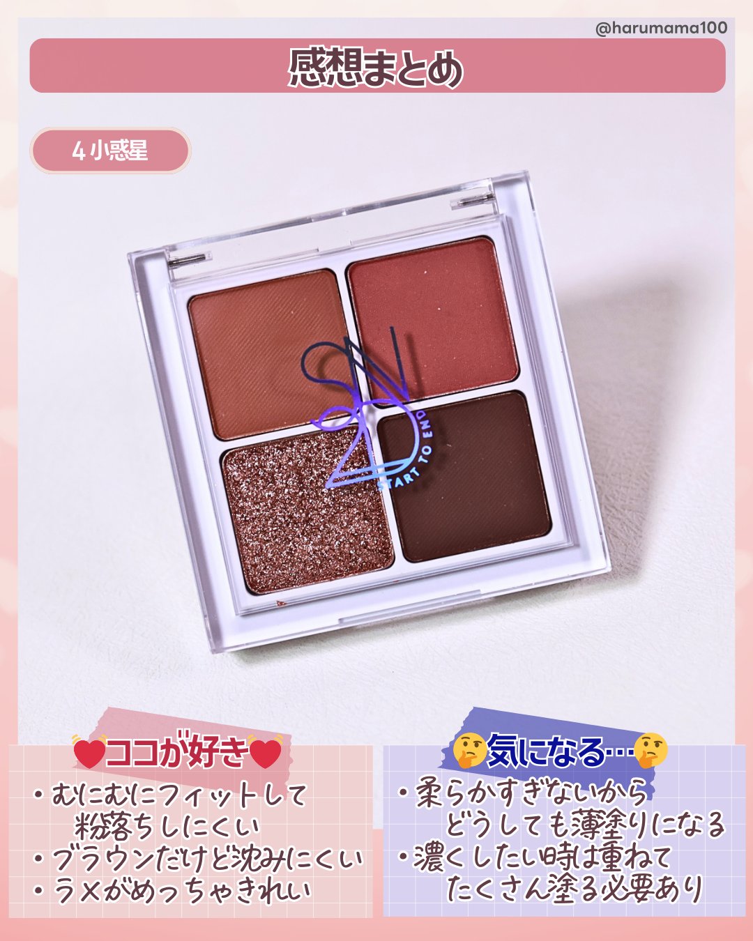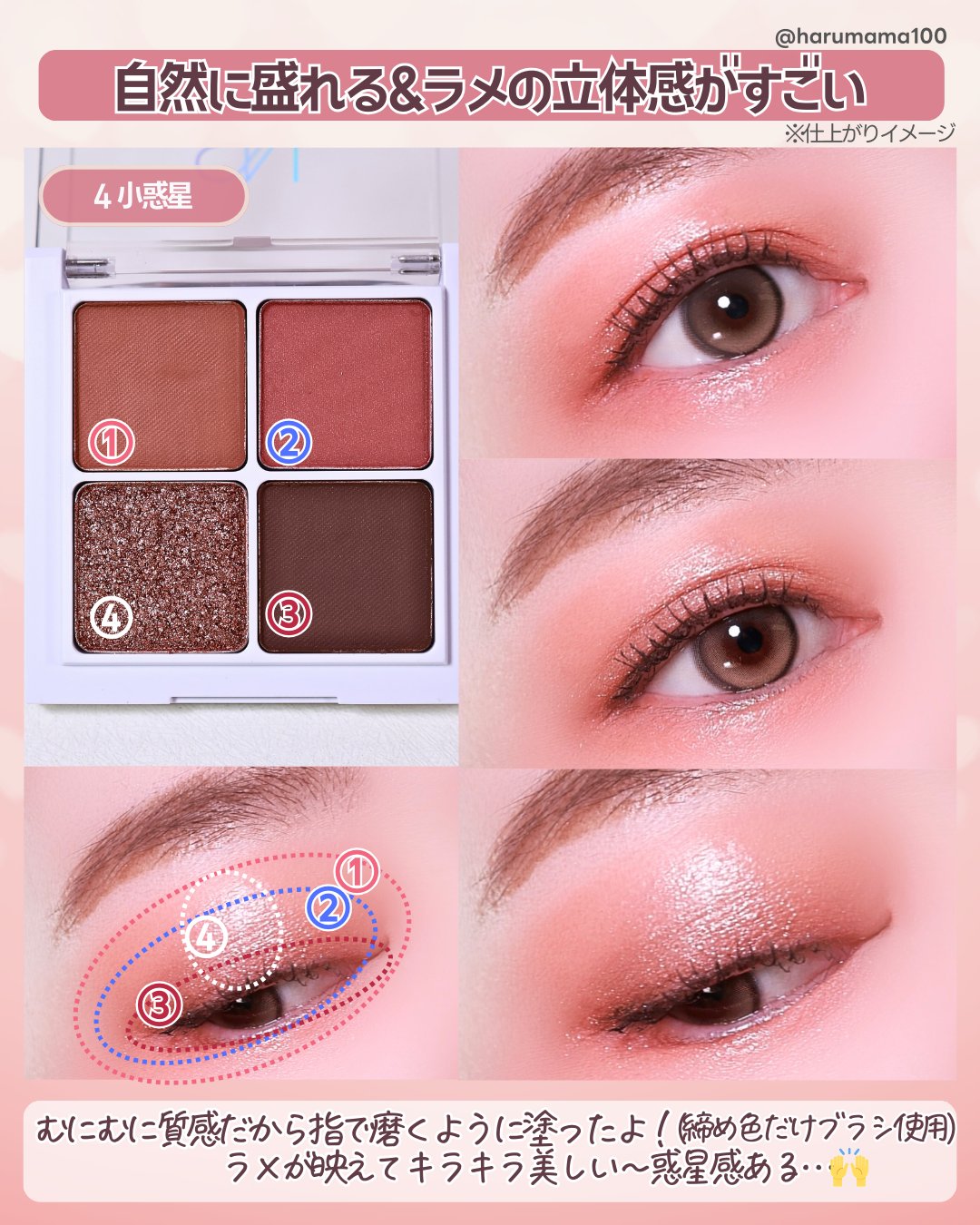 質感はしっとりマットな感じのテクスチャーで、粉・ラメ飛びしにくい高密着ロングラスティングになっているそう。 ブラシより指やチップで塗ると鮮やかに発色するのでオススメだそうです。 私が使ってみた4番の小惑星は、淡いブラウンと締め色の濃いブラウン、サーモンピンクにゴールドラメの四色で グラデーションなども作りやすいバランスの良い配色。 イエベ秋の私には特にピッタリのカラーで、どれもしっかり発色してくれて本当に捨て色なし!