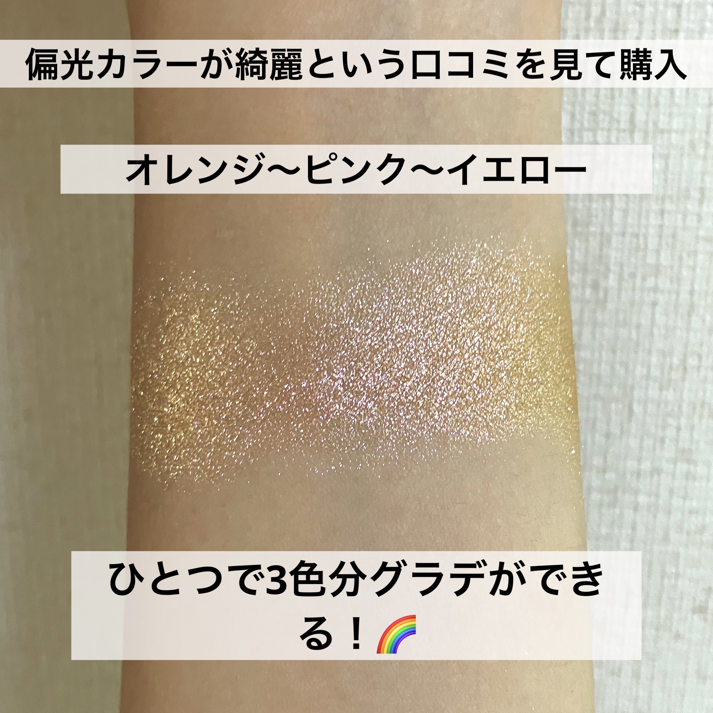 インカンデスントの名前の通り、まばゆいほどに光り輝き、光の角度により異なる色彩に変化するマルチクロムフィニッシュ。 ピンクとゴールドの2色が混ざり合う、リッチで美しいきらめきを目元に。 公式の通りにピンクとゴールドの細かいラメがギラギラでめちゃくちゃ可愛い😆❣️❣️ 角度によって色が変わるのが、また可愛いです✨ 限定色が定番品になってくれて本当に嬉しいです❣️❣️