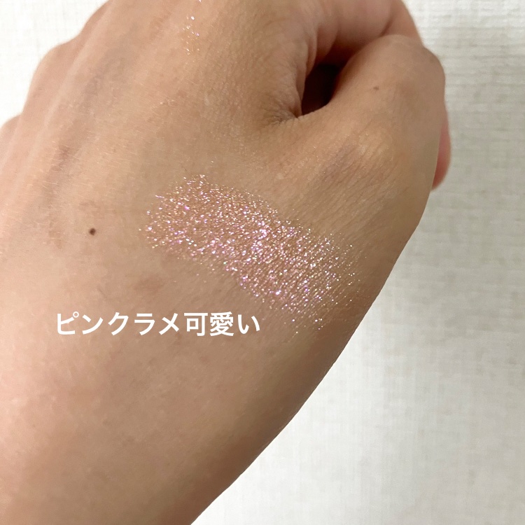実際使ってみたら、綺麗だった! 光で当てるとピンクっていう感じ。もっと早く使えば良かったと思っています。 ラメだから、指乗せはアイメイクの仕上げ、ブラシ乗せはアイシャドウベースとして使うのがしっくりくる。 ピンク系だから、赤系のアイシャドウと相性が良いと思います。