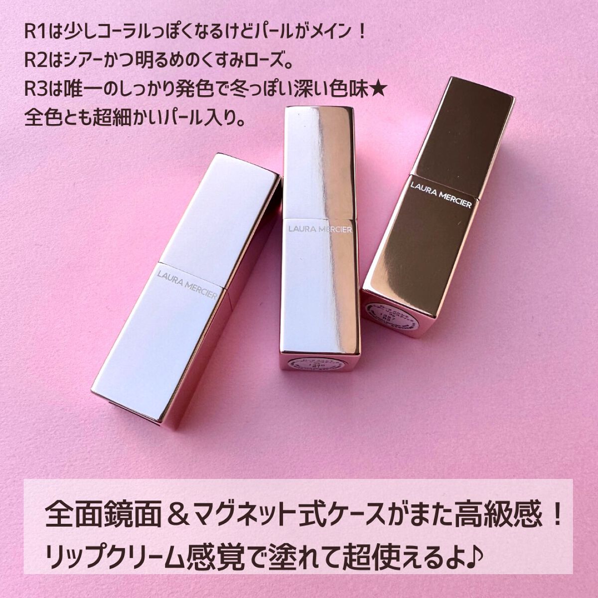 ローズグロウパールがふんだんに入った 透け感のあるリップスティック💄💕 しっとりとした唇をなんと18時間もキープできる! 唇が不安定な時期に1日中つけていても大丈夫だった😳✨ 乾燥が気になるこれからの季節には、 こういうリップ何種類か持っておくと安心よね😌 リップクリームのように優しい塗り心地なのに、 キチンと感が出るのはさすがローラメルシエだと思う🙌 ほどよい血色感に上品なパールが輝いて、 写真以上の可愛さなのです💓 R1とR2は素の唇を活かした仕上がりになるのに対し R3は結構しっかりとしたベリー系。 だからもしもギフトとして人に贈るなら… 単体づかいでも他のリップと重ねるでもいけるR1かな〜🎁✨
