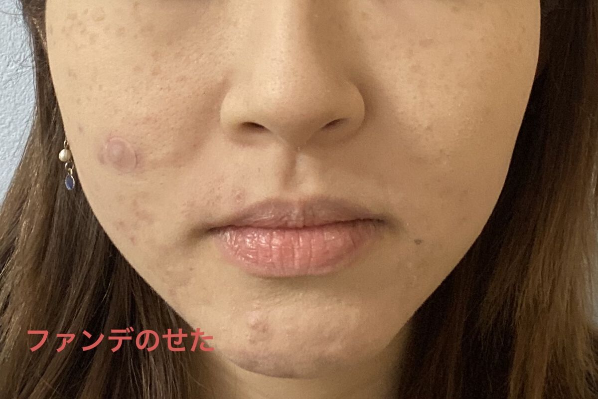 カバー力はそこそこです。(画像を見ていただくと分かると思います) ニキビやニキビ跡の赤味は結構カバーされますが、 そばかすはほとんどカバーされていません。 目立たない程度にラメが入っていますが、 毛穴も若干マシかなくらいのカバー力です。 正直に言うと、崩れます。というか禿げます。 (パウダーだし、肌に優しいので仕方ないかもですが) 下地+ファンデで出かけて、 5時間くらいで頬と鼻はマスクに擦れて禿げてました😇😇😇 画像の通り水には強いですが、擦れには弱そうです。 上からミストやパウダーを塗ったら良いかもしれないです。 乾燥は凄くするわけではないが、しっとりもしない。 ちゃんと保湿してから塗らないと、 肌のカサカサが分かりやすくなるなと言う感じです。 クレンジング不要らしいのですが、 洗顔だけではイマイチ落としきれない印象でした。