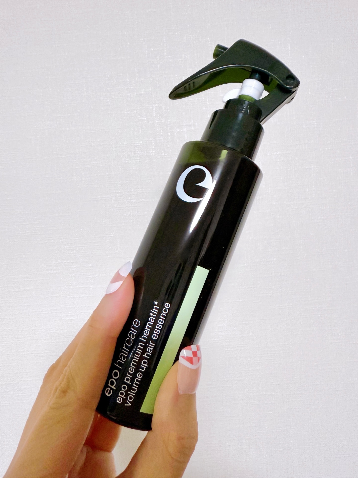 瞬間補修成分のヘマチンを高濃度で配合したepoさんの毛髪美容液𓈒𓏸 シュシュッとするスプレータイプの毛髪美容液! 手に出してみるとシャバシャバかつ色が黒くてびっくり( ◜௰◝ ) シャンプーとトリートメントの間にシュシュッと10秒で終わるので楽ちんでいいなと思いました(ノ)`ω´(ヾ)