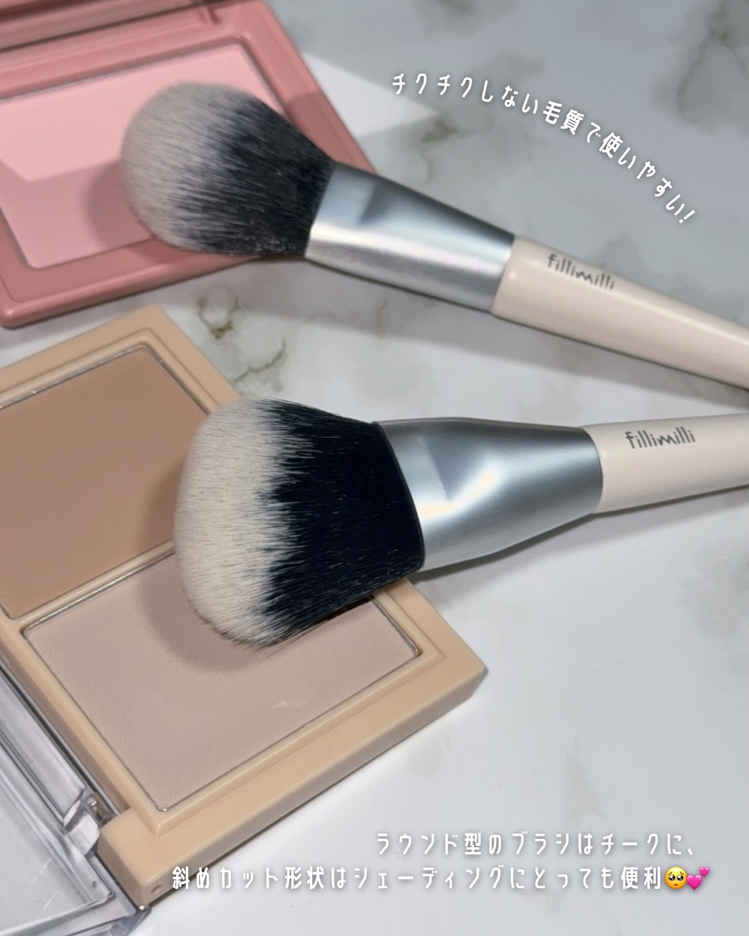 fillimilliのブラシはやっぱりいい♡ 全て使いやすく全て使えます。 アングルドシャドウブラシで目元のハイライトにも使ってます。 コシがあっていい感じ。 ケース付きなのでこのまま持ち運べていいです。 旅行などもコレが1セットあればOK。 オススメ。