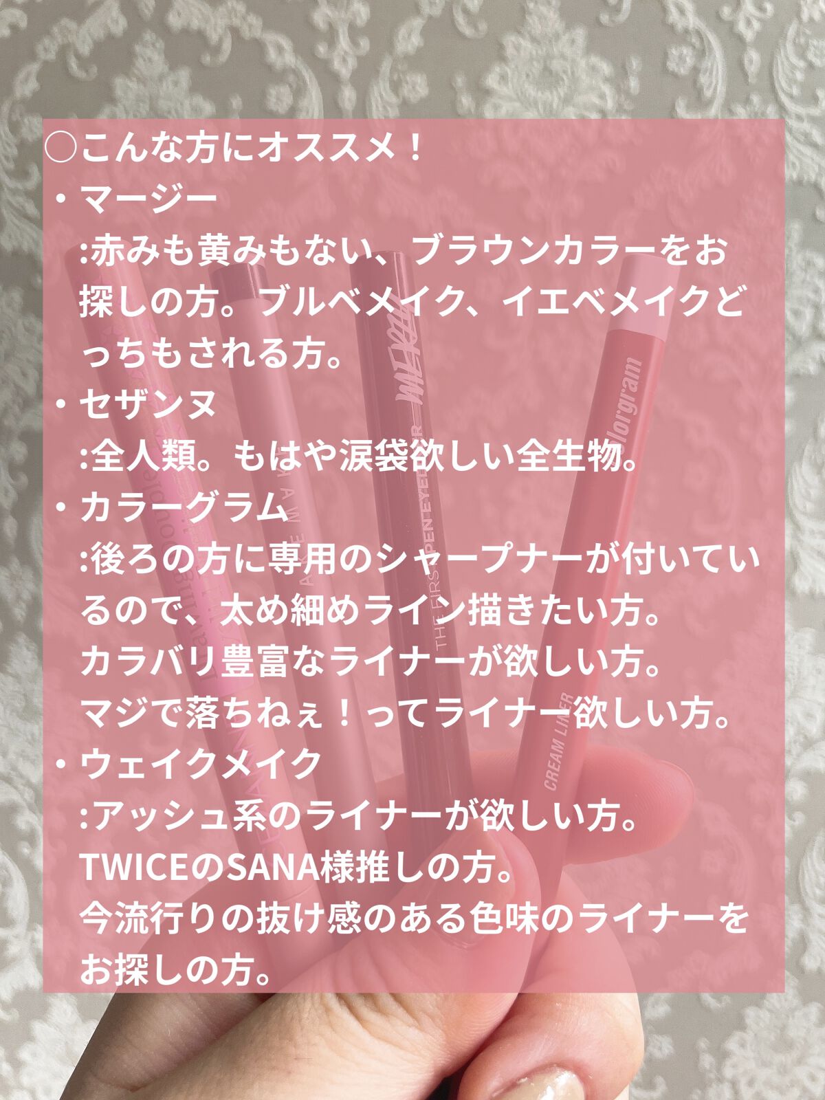 ✨2022年!上半期1番愛用したコスメ紹介!(アイライナー編)✨今回はアイライナーですが、私は1度に複数のアイライナーを使い分けてメイクをするので、今回は毎回どのメイクをする時も使っていた4本のアイライナーの商品となります。○商品名・MERZY:THEFIRSTPENEYELINER (P2BROWNIE)⭕️私が大好きなリップのブランド。おまけで付 いてきて、そこからずっと使ってますw ブラウンだけど、赤み黄みがないから、イエ ベもブルベも使えると思います。 いつも、とりま迷ったらこれって感じで使っ てます。ブラックマスカラ、ブラウンマスカ ラ、どっちとも相性良き👍・セザンヌ:描くふたえアイライナー (20影用グレージュ)⭕️ザ!涙袋描いてます!って感じじゃなくて、 バレない程度に盛れるから、ナチュラルメイ クをする時にも✨ 使い初めてから、鬼愛用してて、一生リピ買 いすると思う。 安いけど、ちゃんと一日中落ちない!・colourgram:CREAMLINER(06coralbrown)⭕️この色が神で、下瞼に仕込む事で、ナチュラ ルに盛れて女の子らしい雰囲気が作れる。 芯が柔らかくて、シャープナーも付いてるか らありがたい🙏✨ しかも、カラバリ豊富。神かよw・WAKEMAKE:REALASHPENCILLINER (01SANDEDBLACK)⭕️その名の通り、アッシュ系のカラー展開のラ イナー。 芯は柔らかく、使いやすい。 目力アップ、だけどどこか抜け感のある、オ シャンティー✨なカラー。 しっかりウォータープルーフだから、粘膜や まつ毛の間を埋めるのにも👍ご参考になれば、幸いです🙇♀️#MERZY#ザファーストペンアイライナー#CEZANNE#描くふたえアイライナー#Colorgram#ArtistFormulaCreamLiner#wakemake#アイライナー#ペンシルアイライナー#動画でスウォッチ#正直レビュー#やっぱこれやねん