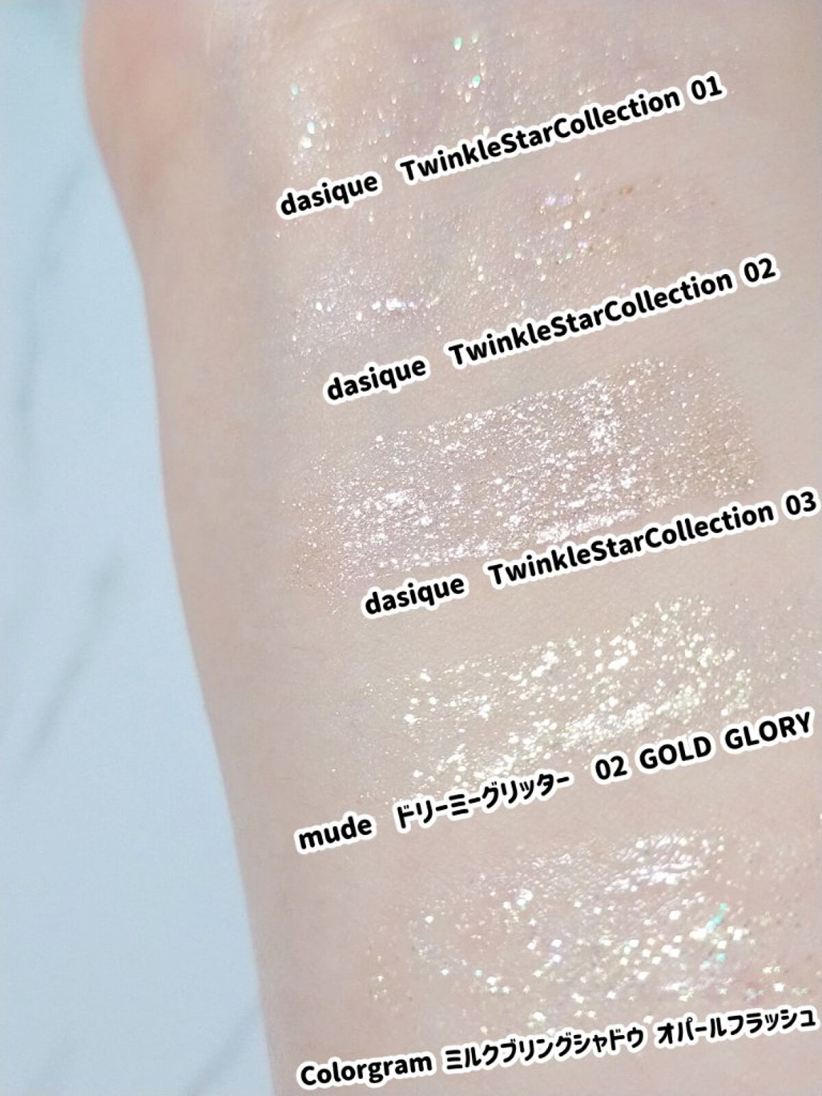 デイジークの1ホワイトベースだけど、オーロラに光るので白っぽさはあまりない。白っぽいピンクラメの印象。六角形の大粒ラメ入り。 デイジークの21と同じく、ベースカラーの発色がないです。コーラルピンクと、青ラメが印象的。六角形の大粒ラメ入り。 デイジークの3ピンクベージュのベースカラーの発色が強く、シルバーラメがメイン。ほとんど細かいラメのみ。大粒ラメはほぼ無かった。 mude ドリーミーグリッター02GOLD GLORY黄色?金色?の細かいラメたちの集合体。その他、オレンジラメもたまにいます。 Colorgram ミルクブリングシャドウ 02オパールフラッシュケースで見ると薄ピンクだし、写真撮るとピンクなんですが…塗ってみると黄緑に光ります。六角形の大粒ラメはデイジークより大きめで主張強めなラメかな…その他オレンジ、青もたまにいます。