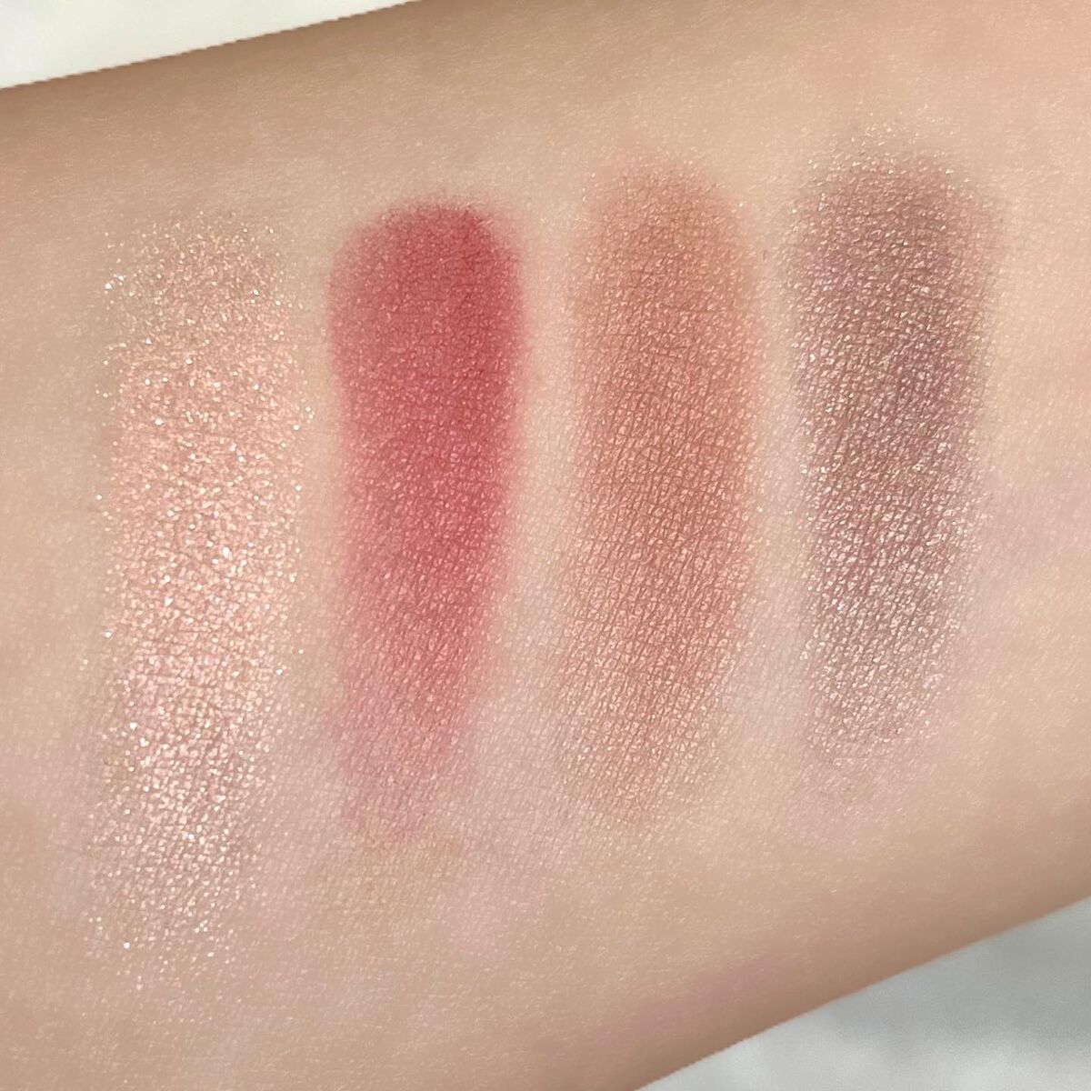 大好きなレイヤードカラーズ!💓 Nostalgic Roseを購入しました🌹 レイヤードカラーズのなめらかしっとり粉質ももちろん健在✌️ この粉質がね、ほんっとに大好きなんですよね🤦🏼♀️💘 まろやかで深みのあるカラーのパレットでかなりシックなイメージかなと思います。 特に右2色がまさにノスタルジックというか(笑) 左の2色は名前にある"ローズ"の通りちょっとピンクみがある感じです💁🏼♀️ 両端はラメ入り✨ 細かくて上品だけど、華やかです💓 で、レイヤードカラーズというだけあって色を重ねて楽しめるのがこのシリーズの良さ🥳 パレットの並び通りにちょっとずつ重ねてみました。 右2色混ぜた色がね、とってもシックで好き♥️ 真ん中2色を混ぜるとローズ感。 赤をどう使うかでかなり印象が変わりそうです🕺🏼 ちょっとトーンが暗めなので似合うのかなと不安はありますがどうにか使うぞ〜🤣