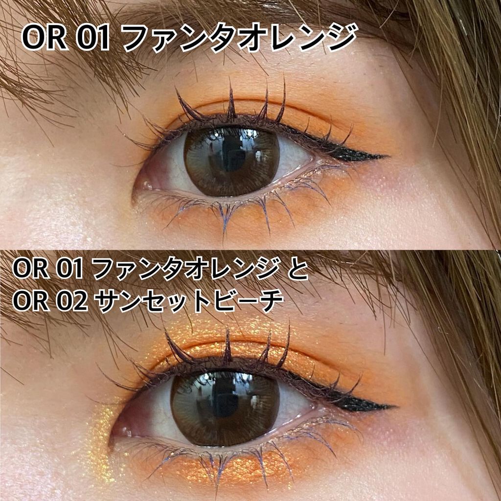 OR 01 マットオレンジしっとり滑らかに伸びるノーラメのオレンジシャドウ。 OR 02 サンセットビーチ細かいゴールドラメがエナメルのように輝くハイライト系ラメ。 OR 03サンセットダイヤモンド透明ベースにオレンジなど多色の大粒ラメがぎっしり詰まったポイントラメ。 OR 03 サンセットダイヤモンドだけ、ブラシの部分が細くなっていて、細かいところにも使いやすいのがポイント◎ 3つとも密着度が高く、夏場でもよれにくいのも嬉しいですよね💖🥺