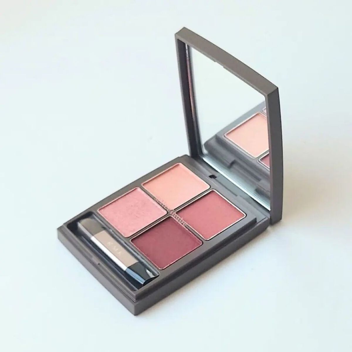 大人っぽいピンク〜ローズ系のパレットでくすみがかったトーンで可愛くも大人っぽくもできる🌹 左上のカラーから時計回りに3色でグラデ作って左下のラメをトッパーに使う…のがオーソドックスな塗り方かなと思いますが、左下のカラーは意外としっかりベースのモーヴピンクが発色するので、メインに使っても可愛いです〜😍 ラメが細かくて光り方も繊細なので広めに塗っても上品に仕上がるのがさすがRMKだなーって感動✨ ピンクみのあるベージュにゴールドパールが入ってて肌馴染みが良く血色感も🆙✨ アイシャドウやハイライトにも使えちゃうマルチアイテムでラプソディーローズと相性ばっちり❤