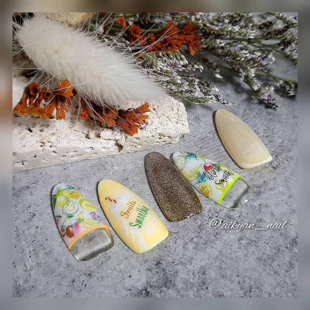 AQUANAIL第5期公式継続アンバサダーの(@aikyan_nail)AIKAです★果物のウォーターシールをいただいたのでぺたぺたしてみました💅🏻たくさんの果物と真ん中に大きいジュースと英語が数個ありました!ウォーターシールはとっても薄いので数枚重ねても厚みがでないのでオススメです✨✻–✻–✻–✻–✻–✻–✻–✻–✻–✻–✻𖤐𝐢𝐭𝐞𝐦𖤐・ICINGGEL ┗【ホワイト】・NEONCOLORGEL ┣【04】 ┗【05】・VELVETGEL ┗【NO.04】・AQUAGEL ┣【E17】 ┗【D18】・ウォーターシール・熊野筆×AQUANAIL ┗【フラット3】・TOPGEL上記はAQUANAILさんの提供品と私費で購入している商品があります※一部私物を使用しています✻–✻–✻–✻–✻–✻–✻–✻–✻–✻–✻いいね、コメント、保存よろしくお願いします🙌❤️質問、要望、リクエスト…etcお気軽にDMください👍▼▼▼ SNS ▼▼▼••┈┈┈┈┈┈┈┈┈┈┈┈┈┈┈┈┈┈┈┈┈┈┈┈┈••プロフィールにリンク集貼ってあります☆Instagram:aikyan_nailhttps://www.instagram.com/aikyan_nailTwitter:AikyanNailhttps://twitter.com/AikyanNailYouTube:aikyannailhttps://youtube.com/channel/UChxek0YohUtXln-Q5rSMatQTikTok:aikyaaan_https://www.tiktok.com/@aikyaaan_••┈┈┈┈┈┈┈┈┈┈┈┈┈┈┈┈┈┈┈┈┈┈┈┈┈••#aquanail#aquanailで可愛くなれる#aquanail公式アンバサダー#セルフネイラー#ネイルアート#セルフネイラーさんと繋がりたい#ジェルネイル#ネイル#ジェル#セルフネイルデザイン#naildesigns#セルフネイル#ネイルチップ#ネイルデザイン人気#nail#nails#アート#nailart#art#design#ネイルデザイン#ネイル#summer#夏ネイル#夏#果物ネイル#ネオン#フルーツネイル#ウォーターシール#ネイルシール#ポップネイル#LIPS投稿アワード_Qoo10メガ割