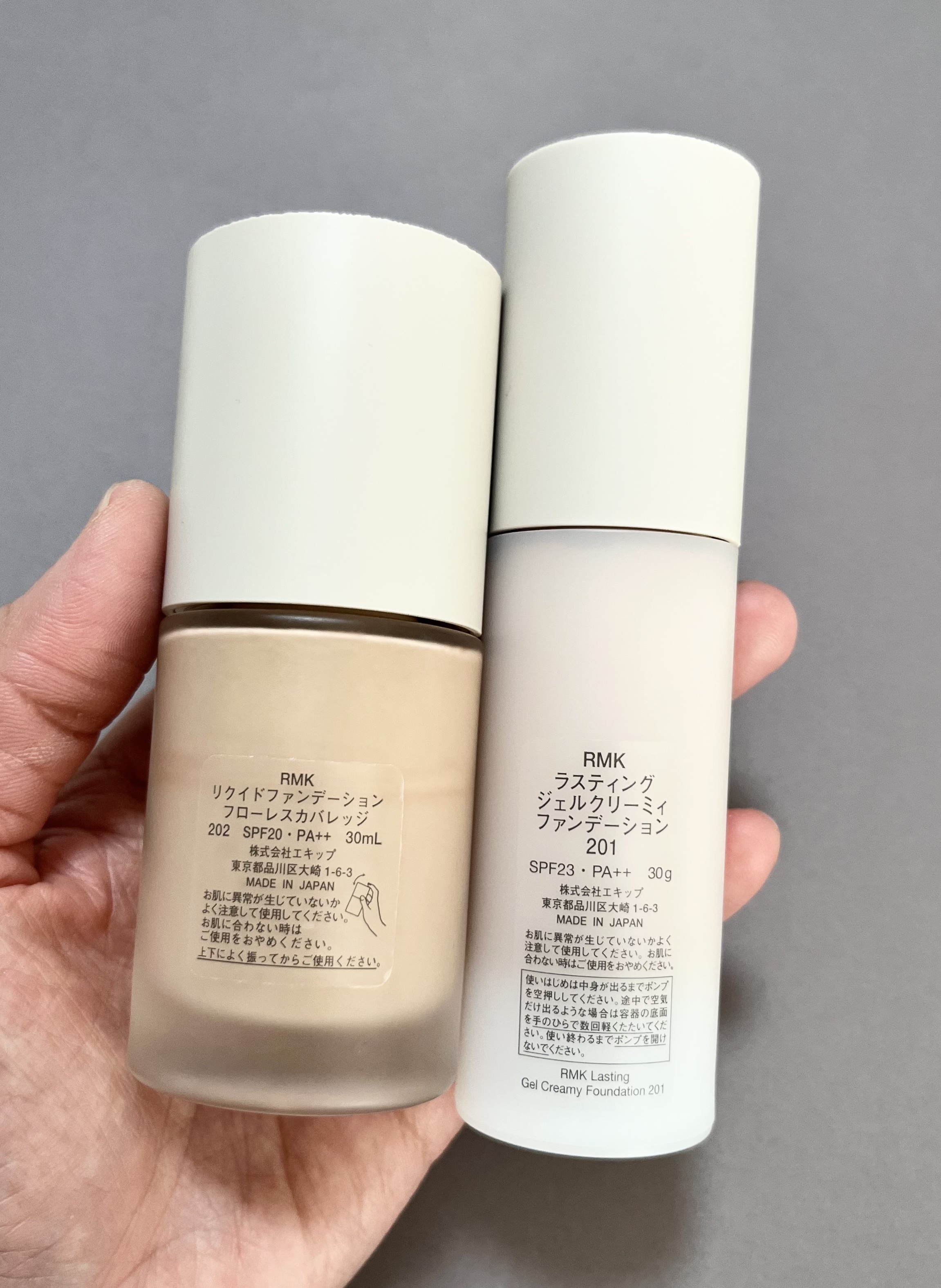 RMK2大ファンデ比較🎵特徴と個人的お気に入りポイントをお伝えしていきます💕リクイドファンデーションフローレスカバレッジ202→リキッド 肌への溶け込みが抜群 よく振ってから使用 重ねても汚くならずカバー力UP 塗布後ベタつかない 崩れにくい すりガラスパケで重ためラスティングジェルクリーミィファンデーション201→名前の通りジェル状 RMK史上一番のカバー力 ブラシ塗りだとスジムラができて仕上がりが 綺麗にできなかったけど、指塗りで問題解決 マット寄りの仕上がりでベタつかない フローレスカバレッジと比べて、よりサラッ と崩れにくい プラスチックっぽい軽めのパケ美白対策のおかげか前より肌が白くなったので、新たに購入したラスティングジェルクリーミィファンデーションは一つ明るめを購入☀️RMKも年々、ファンデのカバー力がUPしていって、一緒に歳を重ねられているみたいで嬉しいです🥰両方良いけど、個人的にはカバー力と自然さを両立したフローレスカバレッジの方が好みかも💡ファンデ迷ったけど、やっぱり信頼のRMK⭐️#目指せ毛穴レス肌#自慢の溺愛デパコス