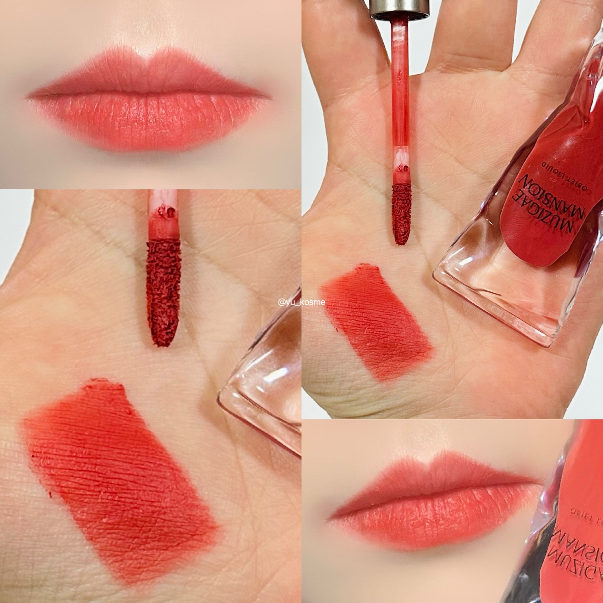 MUZIGAEMANSIONオブジェリキッド 004 Affection数年前にパケに惹かれ買っていて、投稿できずにいました。フローラル様の香りのする、ふわふわマットリップです。粘膜色様のピンクですが、黄みを感じます…しっとりした使い心地ですが、ベースのリップのコンディションが整っていないと、皮向けや縦皺が気になるかも…ですアプリケーターはふわふわで塗りやすいです。