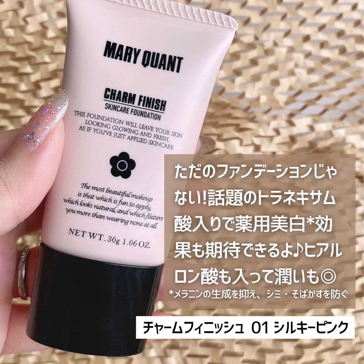 MARYQUANTのニューフェイス💕シンプルだけど可愛い、黒いデイジーマークがシンボルのMARYQUANT❤️今回は、LemonSquare様を通じて、【MARYQUANT】様から【ネイルポリッシュ3点とチャームフィニッシュ】を提供していただきました😌*--------------------------------------ネイルポリッシュ全52色10ml/1,650円(税込)-------------------------------------- これは速乾!サラサラめの程よいテクスチャーで、ササッと塗り広げられる🎶(匂いは普通にあるので、換気してね💦)セルフネイルは好きなんだけど、グチャっとなっちゃう事が多いけど、これはグチャってならなかった😂(カラーによるかもだけど)いただいたカラーは1度塗りでも可愛い😘❤️全52色のファッションに合わせて楽しめる豊富なカラバリで、コーディネートのアクセントになりそうなカラーから、ポップなカラー、くすみカラーなどトレンド感のあるカラーまで❤️オリーブ油、ローズヒップ油、ホホバ油3種の植物性オイルが、爪にうるおいを与えて乾燥から守り、健やかに保ってくれるというのも嬉しいポイント💅 -------------------------------------- チャームフィニッシュ01シルキーピンク30g/3,850円(税込)--------------------------------------【医薬部外品】下地の要らない薬用美白※1スキンケアファンデーション💕機能盛りだくさん🎶↓↓↓✧SPF32PA++✧無香料、エタノールフリー、鉱物油フリー、紫外線吸収剤フリー《スキンケア機能》✧美白※1有効成分・トラネキサム酸配合でメラニンの生成を抑え、シミ・そばかすを防ぐ✧保湿成分でメイクしたてのうるおいキープ✧大気中微粒子物質からも守る※2《メイクアップ》✧下地なしでもピタッとフィット✧化粧崩れ防止✧凸凹カバー✧透明感※3&ツヤ感アップ*細口ノズルで量が調節し易い♪ピンク色01シルキーピンクはまさにピンク色で伸ばすと肌にピタッと肌にフィット!手早く伸ばした方が良いかな?ほんのりとピンク色のフィルターをかけたように、血色感と透明感、トーンアップ❤️変にベタベタ、ヌルヌルはせず、ほんのりツヤのある素肌の様な仕上がり♪軽い赤みや毛穴の凸凹などはカバーしてくれるものの、シミ・そばかすへのカバー力は控えめなので、コンシーラーの併用推奨です😌フェイスパウダーを使うと、さらにふんわりとした仕上がりに💕*結構ナチュラルだけど、素肌から綺麗に見えるので、✧元々肌が綺麗なんです💕といったナチュラルな仕上がりをお求めの方✧メイクでもスキンケア機能が欲しい方✧スクールメイクとか、メイクをあまり派手にできないお仕事の方にも良さそう❤️※1メラニンの生成を抑え、しみ・そばかすを防ぐ※2皮膜効果により付着を防ぐ※3メイクアップ効果による#newネイル