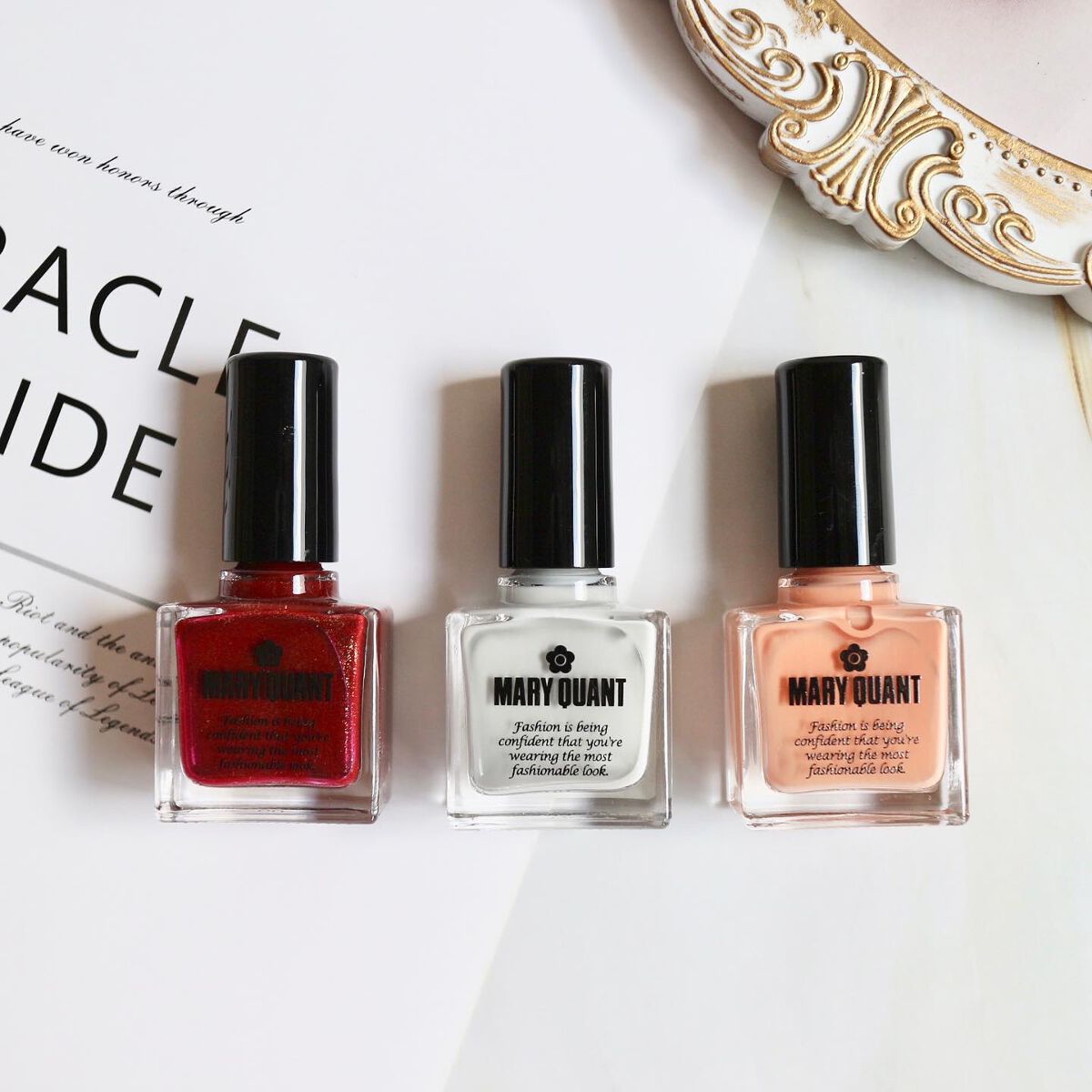 •.MARYQUANTの時短ファンデ&ネイル♡/.•⋈・・・・・・・・・・・・・・・・・・・・・・・・・・・・⋈【MARYQUANT/マリークヮント】❁チャームフィニッシュ《01:シルキーピンク》30g・3,850円❁ネイルポリッシュ《004ルビーレッド》《026アイスグレー》《009ジンジャーオレンジ》各10ml・1,650円⋈・・・・・・・・・・・・・・・・・・・・・・・・・・・・⋈MARYQUANTの新作コスメ✨時短メイクにぴったりな薬用スキンケアファンデとカラバリ豊富なネイルポリッシュが登場🌷 🌻チャームフィニッシュ《01:シルキーピンク》優しいほんのりピンクカラーが透明感とほんのり血色感を与えてくれる下地いらずの薬用スキンケアファンデーション✨白くなりすぎず、自然なトーンアップを叶えながら色むらを補正&毛穴をいい感じのナチュラルさでカバーしてくれます😊《SPF32・++》とUV対策もばっちり♡しっとりとした保湿力を感じつつもスルスルと伸びて、塗り心地もなめらかです♡元々素肌が綺麗だったかのように仕上げられるのでマスクメイクならこれ1本だけでも良いし、ふんわりとパウダーをつけるだけでもとっても綺麗な美肌に仕上がりますよ〜🌷✨メラニンの生成を抑え、シミ・そばかすを防いでくれる美白成分や、紫外線や排ガス、ブルーライトなどの有害物質から肌を守ってくれる美容液成分配合でメイクを楽しみながらスキンケアまでできる優秀なファンデーションでした♡ 🌻ネイルポリッシュマリークヮントらしいポップなカラーから、ダークカラー、くすみカラーなど、トレンド感のある全52色!乾きが早いので、“ちゅるん”っと抜け感のあるトレンドネイルがあっという間に完成♡両手塗り終わる頃には、最初の手が乾いていました🙂ササッと塗ってもハケの跡が付きにくく、つるんと仕上がるのでマニキュア初心者さんでも塗りやすいと思います◎不器用な私でも綺麗に仕上げることができましたよ♡3種の植物性オイルが配合されているから爪にうるおいを与えて乾燥から守ってくれるのも嬉しいポイントです♡《044ルビーレッド》深いボルドーの中でさり気なく輝くゴールドガラスパールが可愛いカラー♡1度塗りでしっかり発色してくれました。《026アイスグレー》ほんのり水色感のあるグレー。シアーな発色なので2.3度重ね塗りをするとしっかりと発色してくれました。《009ジンジャーオレンジ》派手になりすぎず、肌馴染みのいいオレンジ🍊こちらはシアーな発色ではないけれど、2.3度重ね塗りするとムラなくちゅるんとします♡