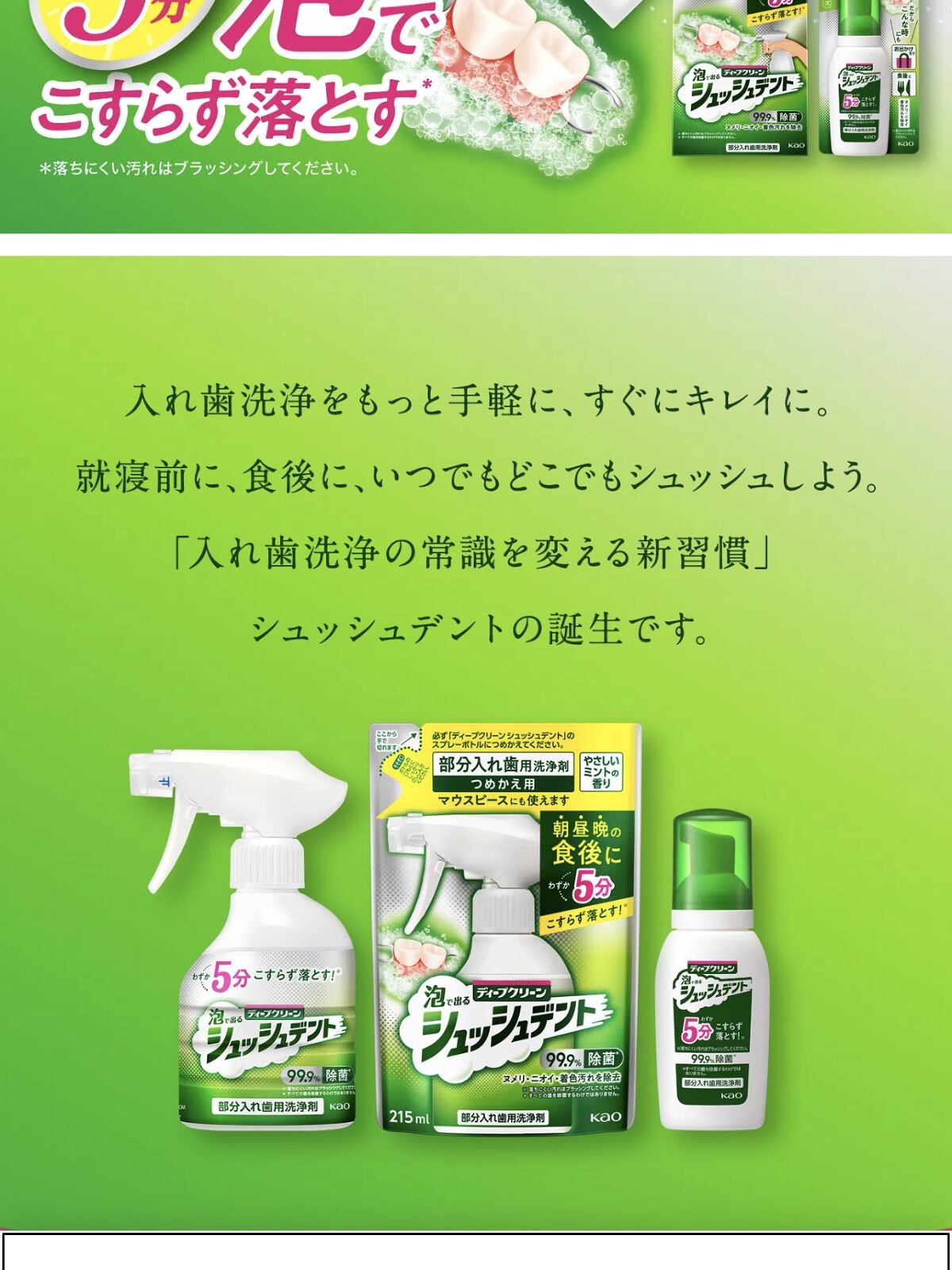 🦷✨ディープクリーン泡で出てくるシュッシュデント使用レポ✨🦷部分入れ歯のケアって、どうしても「一日中つけ置きタイプのタブレット」が定番ですよね🤔💭でも、こちらは、泡でシュッとスプレーするだけでケアができる、とっても便利なアイテムです🫶🌿使い方はとても簡単❣️💚①部分入れ歯をコップなどの容器に入れ、🦷歯1本につき1プッシュを目安にスプレー✨⚠︎ᴾᴼᴵᴺᵀ⚠︎入れ歯全体が泡で覆われるくらいが目安🫧💚②そのまま約5分待つだ👁️🗨️⏰ゴシゴシこすらず、水で洗い流すだけで汚れを落とすことができめっちゃ簡単🫶✨むすびめ🪢が特に助かっているのが、🚪急な来客前や外出前❣️気になっていた部分入れ歯のニオイが、5分で手早く簡単に爽やかなミントの香り🌿にリセットされるところです😊さらに、99.9%除菌してくれるとのことで、除菌力の面でもとても心強いなと感じました🫶💚✨部分入れ歯だけでなく、🦷マウスピース🦷矯正用リテーナーにも使えるのも嬉しいポイントです🙌1本で約90回分使えさらに1000円以内で購入することができるのでコスパ面でも優秀だと思います🫶✨もちろん、シミや頑固な汚れをしっかり落としたい時は、🌙夜にタブレットタイプ+専用ブラシ🪥でつけ置きケアが安心だと思います🫶☘️そして🪴むすびめ🪢が考えた利点🪴🐸✔忙しい時の簡単ケア🌬🐸✔外出先や旅行✈️🧳🐸✔災害時の備え🆘⛑️🦺を考えると、こうした手軽なケア用品があるのは本当に心強いです🥺💚部分入れ歯のニオイや汚れに悩んでいる方に、ぜひ一度チェックしてほしいアイテムです🫶🫧🌱💚🫧*・.。・.。*💚🎵**・.。*💚🎵🫧*💚拙い文章ですが最後まで目を通していただき、本当にありがとうございました㌰(*˙˘˙)*.ˬ.))☘️#花王#ディープクリーンシュッシュデント本体270ml#ディープクリーンシュッシュデント#ディープクリーン#シュッシュデント#部分入れ歯ケア#入れ歯洗浄#オーラルケア#防災グッズ#簡単ケア#時短ケア#除菌ケア#お便利グッズ#マウスピースケア#部分入れ歯洗浄剤#矯正用リテーイナーケア#ディープクリーンシュッシュデントつめかえ用215ml