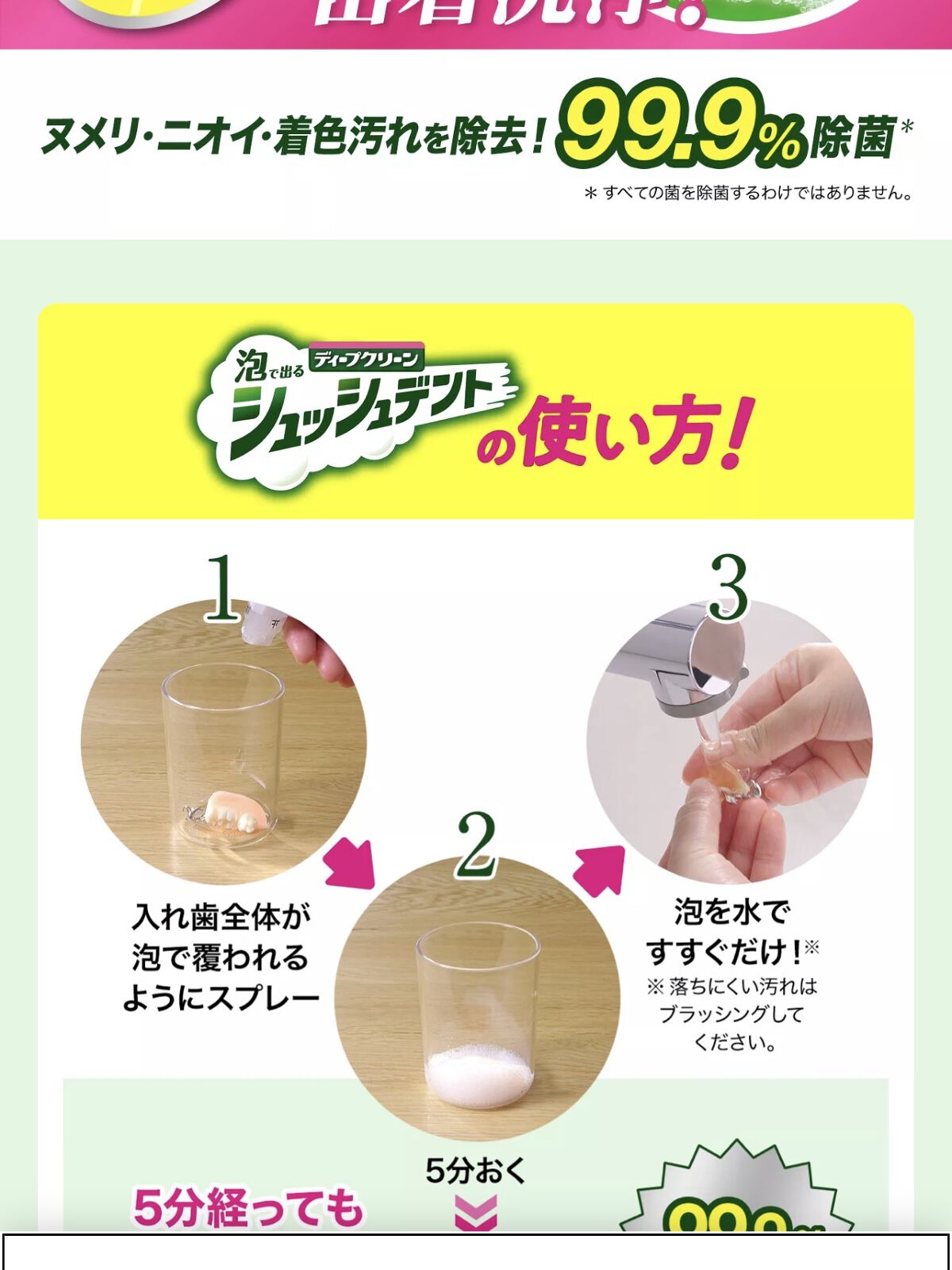 - 部分入れ歯にシュッと直接スプレー。 5分おいたら、水ですすぐだけ、こすらず落とす※!ヌメリ・ニオイ・着色汚れを除去。99.9%除菌*。 やさしいミントの香り。 総入れ歯・マウスピース・矯正用リテーナーにも使えます。 ※落ちにくい汚れはブラッシングしてください。*すべての菌を除菌するわけではありません。
