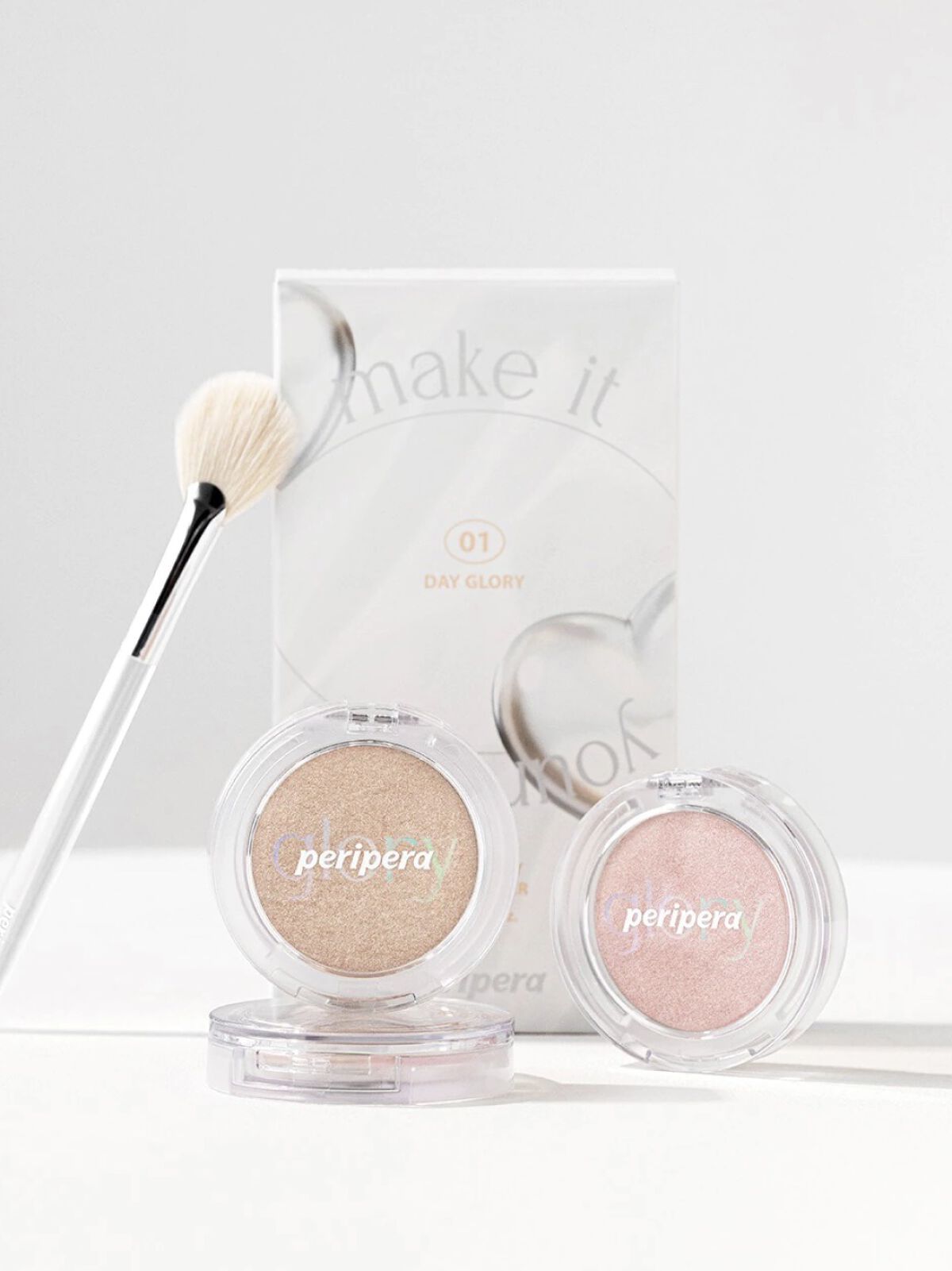 ちょっと変わったハイライトブラシが付いててお手頃価格だったので、01、02両方購入しました😆❣️ 01 DAY GLORY は、デイリー使いしやすい肌に馴染むけどしっかりパールの煌めきがあるハイライター✨ 02 NIGHT GLORY は、ピンクの偏光ラメがロマンチックでラメ粒の大小がランダムなので結構煌めきが目立つ感じがします✨ どちらも可愛くて、ぼかしやすく扱いやすいパウダーハイライトで買ってから結構ヘビロテしてます☺️しっとり過ぎない粉質のわりに密着力もあるようで、ラメ飛びとかは私はあまり気にならなかったです😃 ブラシも他になかなかない形状で、粉を払ったり薄ーくのせるのに重宝します!ケース付きなのが嬉しい😍 日本の店頭では見かけたことないので、qoo10等の通販で買うのが良いかと思います❣️