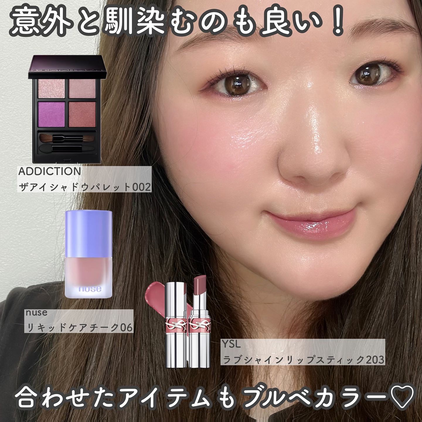 それが#アディクション の魅力 2つめのパレットはInstagramのアンケートで皆に決めてもらった002 #EverlastingLilac 左上のブルーパール輝くラメがめちゃかわ ブルベさんパレットだけど右下のおかげでイエベさんでも使えると思います 苦手な色は得意な色と混ぜて 単色で使う時は狭い範囲で使うこと これが私のブルベ偽装法 リップもPOLAB.Aの05カシスで青みの艶を仕込んだ上でエテュセのブラウンリップを塗っています パーソナルカラーだけで使わないのは勿体ない!