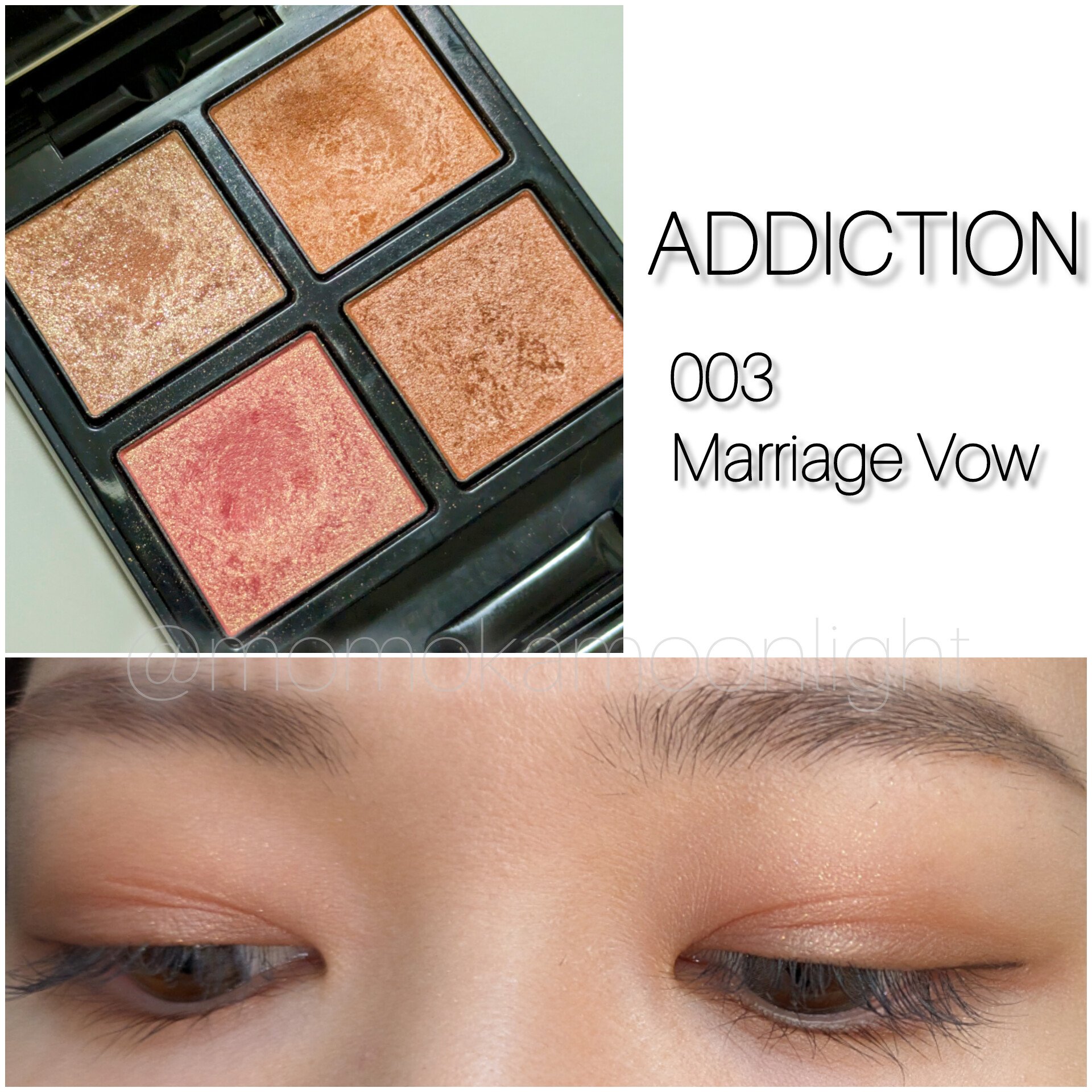 ADDICTIONのザアイシャドウパレットから人気色【003marriage vow】を紹介! これで、写真のような最強かわいいピンクメイクの完成です✨ 4色のパレットになっていて、私がよくやる使い方は、