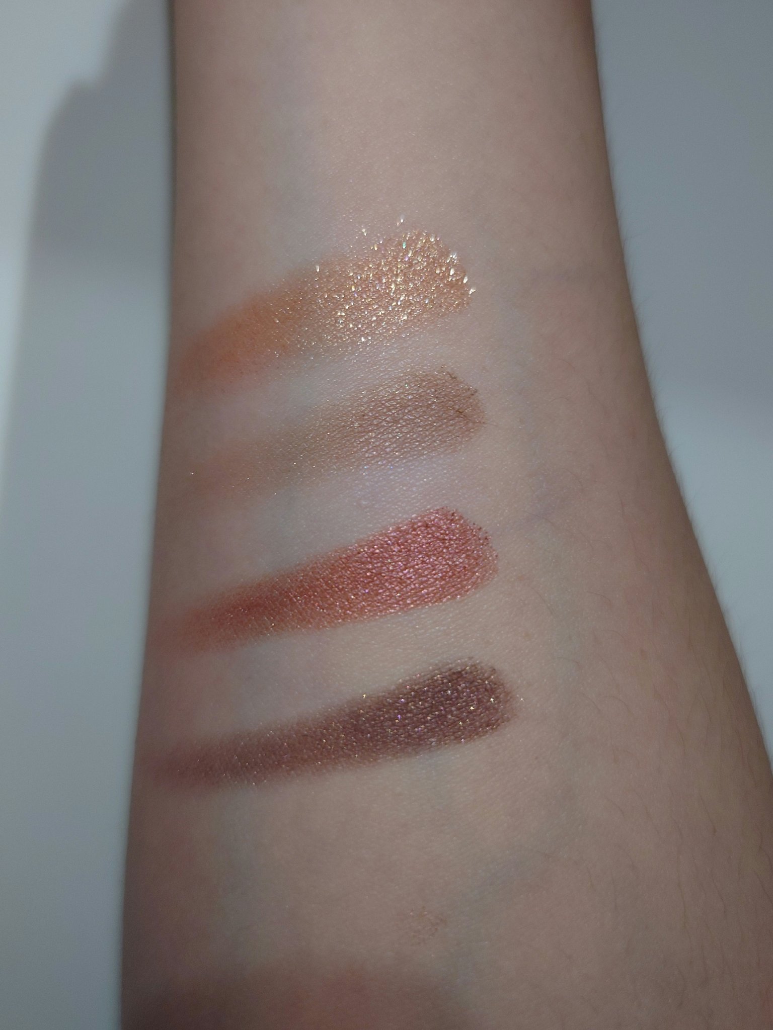 さすがの粉質の良さに絶妙な色 左上のキラキラがやばいのね✨ ベージュのベースカラーにゴールドのラメがふんだんに入ってる! 深みを持たせるのにぴったりのトープカラーも欠かせないし、ちょっとバーガンディっぽさも感じる落ち着きのあるブラウンもバランスが取れてて素晴らしい👍 イエベ秋さんは特に得意かと👍