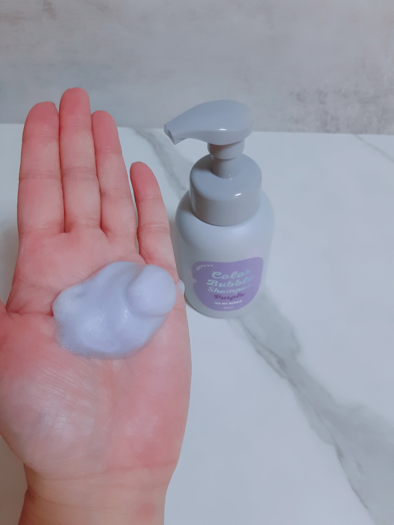 OHMYBUBBLEカラーバブルシャンプーパープルヘブンカラーシャンプーの染まりムラを解決!泡で出てくるカラーシャンプー「オーマイバブル」ポンプを押すだけで簡単モコモコ泡!泡で染めるからムラになりにくい!カラーごとにこだわったまるでスイーツのような甘く幸せな香り泡でムラなく染め、美容成分によりダメージを受けた髪にツヤをプラス【オーマイバブル カラーバブルシャンプー】パープルヘブン:ハイトーンの方におすすめ。黄ばみを抑えてくれるパープル。👍・ショートで3プッシュすればかなりモコモコに泡立ってくれる(元々泡で出てくるけど)・時間が経っても泡がへこたれない。・手や壁などあらゆるものが一切い汚れないので凄く楽で良い!・頭皮が荒れなかったし、痒みなどもなく使えた。👎・軋む、指通り悪いどころじゃなくて通らないレベルでキッシキシ。(ただトリートメントすると直ぐにおさまるのでそこまで問題ではないかも。)・香りがマシュマロキャンディらしいのですが、人工的な甘い香りがするので得意じゃない人が出てきそう。・ある程度の明るさがないと色が入ったのかわからない。・継続して使うと本当に髪の毛が痛むので正直カラートリートメントの方が個人的には好きかも。