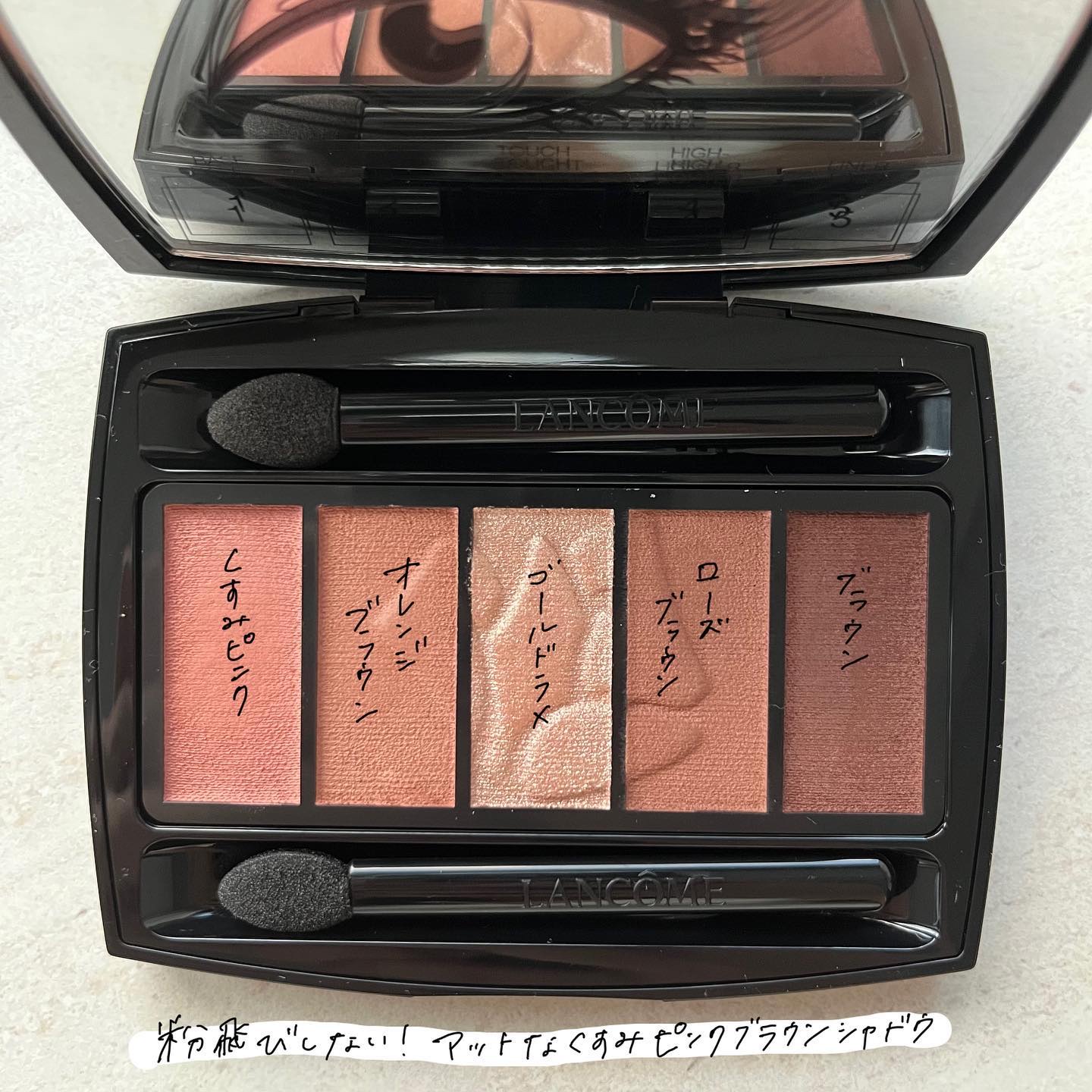 テクスチャーはしっとり。 LANCOMEのアイシャドウ初めて使いましたが、粉質の良さにびっくりしました。 発色も良き🙆 特にこのパレットは、絶妙なくすみ具合で本当に可愛い❤️❤️❤️ ピンクが絶妙に効いていて、可愛いく出来ました🥰🥰🥰