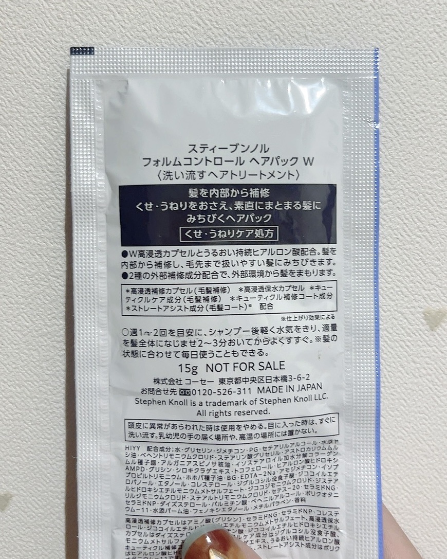 リニューアルしたスティーブンノルニューヨークのトライアルを試してみると、かなーり良かったです♡4種のシャンプー&コンディショナー・ヘアパックのトライアルなので各2回ずつの使用になります。わたしの髪質は毛量多め硬め…いわゆる剛毛太めうねり・乾燥・パサつきヘアアイロン使用頻度…ほぼ毎日ヘアカラー…ブリーチ2回悩みはダメージです!なので、4種の中で1番リペアコントロールがとっても合いました!!◉リペアコントロールオレンジ色のやつです。とにかくめっちゃよかった!感激‼︎髪のダメージが悩みの方にはぜひこちらをオススメします!乾燥した毛でもしっかり泡立ちが良く、使用後はとても潤ってしっとりしなやかに♡ハイトーンカラーの方やパーマやコテで毛先の痛みが気になる方、わたしと似た毛質の方にはぜひ!これは現品買う!ってすぐ思いました!毛が太い・剛毛の方に◎毛量が普通〜多めの方◎ハイダメージの方◎◉カラーコントロールピンクのやつです。こちらもしっかり保湿効果があり充分ダメージを補習してくれます!髪色長持ちさせたい方や、カラーリングによる痛みがお悩みの方に♩ただ、ハイトーンやカラー直後のハイダメージがお悩みの方はリペアコントロールが◎毛が普通の太さ〜硬め◎毛量が普通〜多めの方に◎◉フォルムコントロールブルーのやつです。クセ、うねりがお悩みの方に。とても軽い感触ではないですが、リペアやカラー用に比べると若干軽いかな?という感じで、しっかり潤います!寝癖が気になる方・いつも同じ方向に髪が跳ねちゃう方・髪をよく結んでうねりの跡がついてしまってる方に◎毛が細毛〜普通毛の方に◎毛量が少なめ〜普通の方に◎クセがお悩みの方に◎◉モイスチュアコントロール紫のやつです。泡立ちも軽く、しっとり補修してくれました♩私は軽めに感じましたが、量多めに使用すると充分な泡立ちでいろんな髪質の方に幅広く使用出来るかなと思いました。猫っ毛の方・髪にコシがなく、ペターとなりやすいけど、ダメージが悩みという方に◎カラーリングや、ヘアアイロンによる痛みも気になるけど、ダメージ用を使うと重たいと感じる方に向いてるかなと。毛が猫っ毛〜普通毛◎毛量が少なめ〜普通◎毛先のパサつき・乾燥お悩みの方に◎すいません、あくまでも私が感じた感想なので個人差があると思いますのでご了承下さい🙇♀️あと!香りがすんごく良くてとーっても癒やされたので、ぜひ気になる方はトライアルから試してみて下さい♩シャンプーW/コンディショナーW→¥110ヘアパックW→¥77でした♡