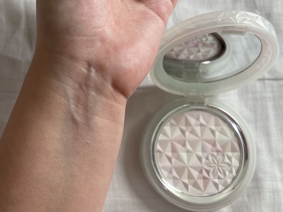 なんてきれいなの…😍 見てるだけでも自然と笑みがこぼれちゃう😆 このフェイスパウダーは6色もの カラーを使用していて、これらの色が 混ざり合うことで透明感や血色感など なりたい肌の演出をサポートしてくれます😲 それだけでなく、肌のくすみや凸凹などもカバーしつつ、テカリやヨレ、メイク崩れなど見せたくない部分を防いでくれるそうです😌 カメラの撮影の仕方が良くなかったのか 手の甲に塗布してるのがとても分かりづらい感じになってしまってますが、薄付きで粉っぽさもなく、使い勝手が良かったです😉