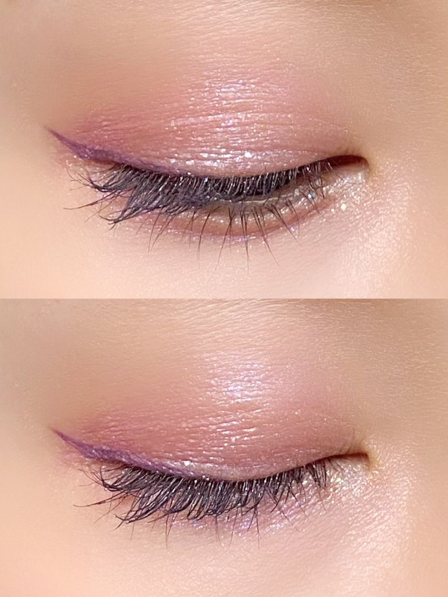 ラメがしっかり入ったパープル寄りのピンクぽいカラーのシングルアイシャドウ。 ラメが多いのにザラザラせずに、しっとりした使用感で使いやすい。 これ一個で使うのはもちろん、他のカラーの上に乗せるとピンク味を増したりできるなど使い方は工夫次第! ラメはピンク、青ラメ、パープル、ちょっとシルバーぽい雰囲気も。 しっとりしてるからこそ指塗りがオススメなので、手を汚したくない方、ブラシを使いたい方は発色が抑えめになるので注意。 青ラメはそこまで強くないのと、ピンクぽい感じになるので試せるなら自分の目に試してから購入を検討した方がいいかも。 ピンクメイクが好きな方。 いつものアイシャドウの雰囲気を手軽に変えたい方。 青ラメが派手過ぎない感じで使いたい方。 指で塗るのがしっかりと色が乗るのでオススメ。 ハイライト部分としても、全体的に塗っても◎