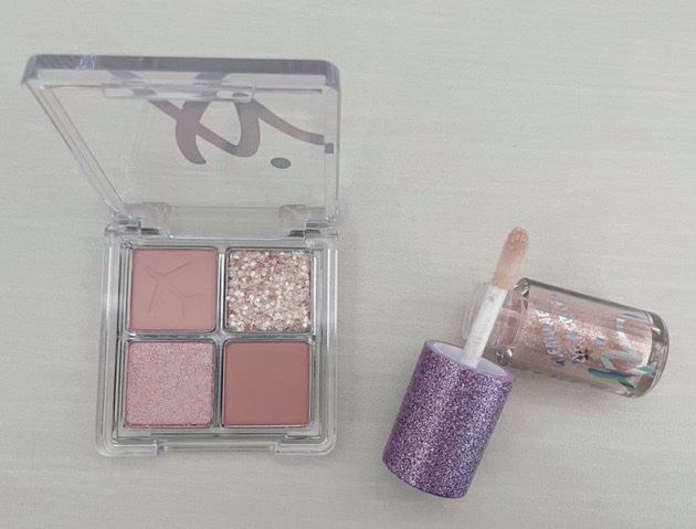パレットで出会う旅の感性がコンセプト パレットは、青みにも黄味にもよってない、くすみのないピンクが春メイクにぴったり! マットはふんわりサラサラな粉質で粉飛びなしでした◎ ラメは細かいラメ(ベリーソーダ)の方がお気に入りで、涙袋に入れるとかわいかったです🫶🏻 細かいラメに大粒ラメ(ロンドンポップ)を重ねて、華やかでかわいい印象に💕 グリッターは本当にキラキラな輝き✨ 密着力がよく、ピンポイントでラメを乗せられるがよかったです◎ 個人的にはアイシャドウはマットが好きなので、2色のマットに細かいラメを涙袋に入れるのが好きでした。