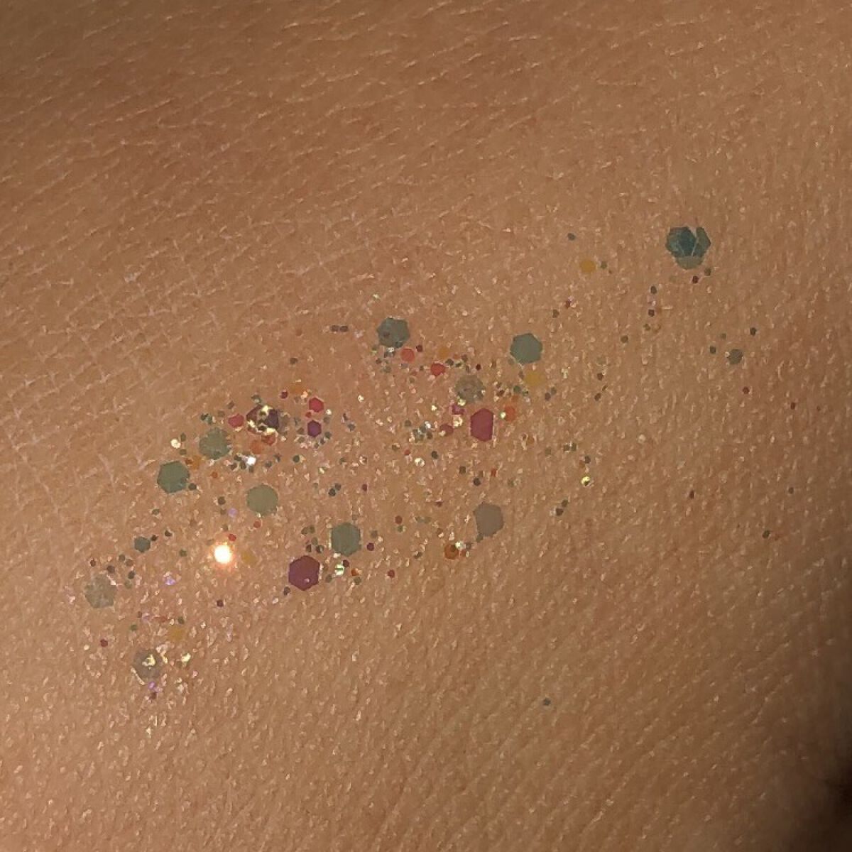 大粒グリッターは派手になりすぎてしまって、私では上手に使えないんじゃないかと思っていましたが、このアイテムは透明感のある輝きでとっても使いやすい大好きなアイテムです❤️ ホログラムも透明感があり、メタリックにギラギラ輝くというより、光にあたってキラっと光るタイプです。 結構水っぽいです。その分広がるので、思っているよりも少なめにちょんっとつけてから、広げる方が程よい量をつけることができました🙆♀️ グリッターにしては容器のサイズが大きめかなぁ、と思います。ヒロインメイクのマスカラより少し高さが短く、太いです。