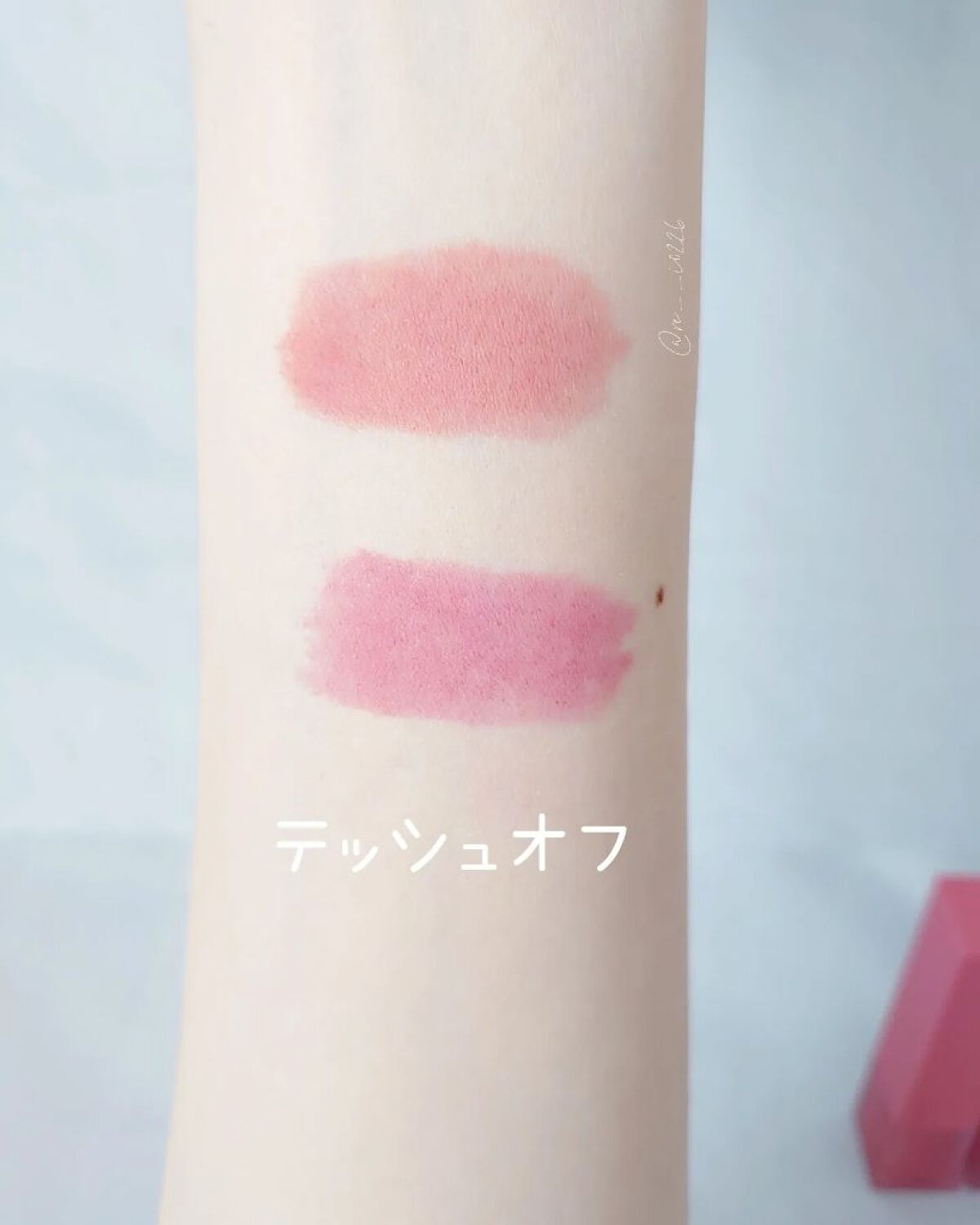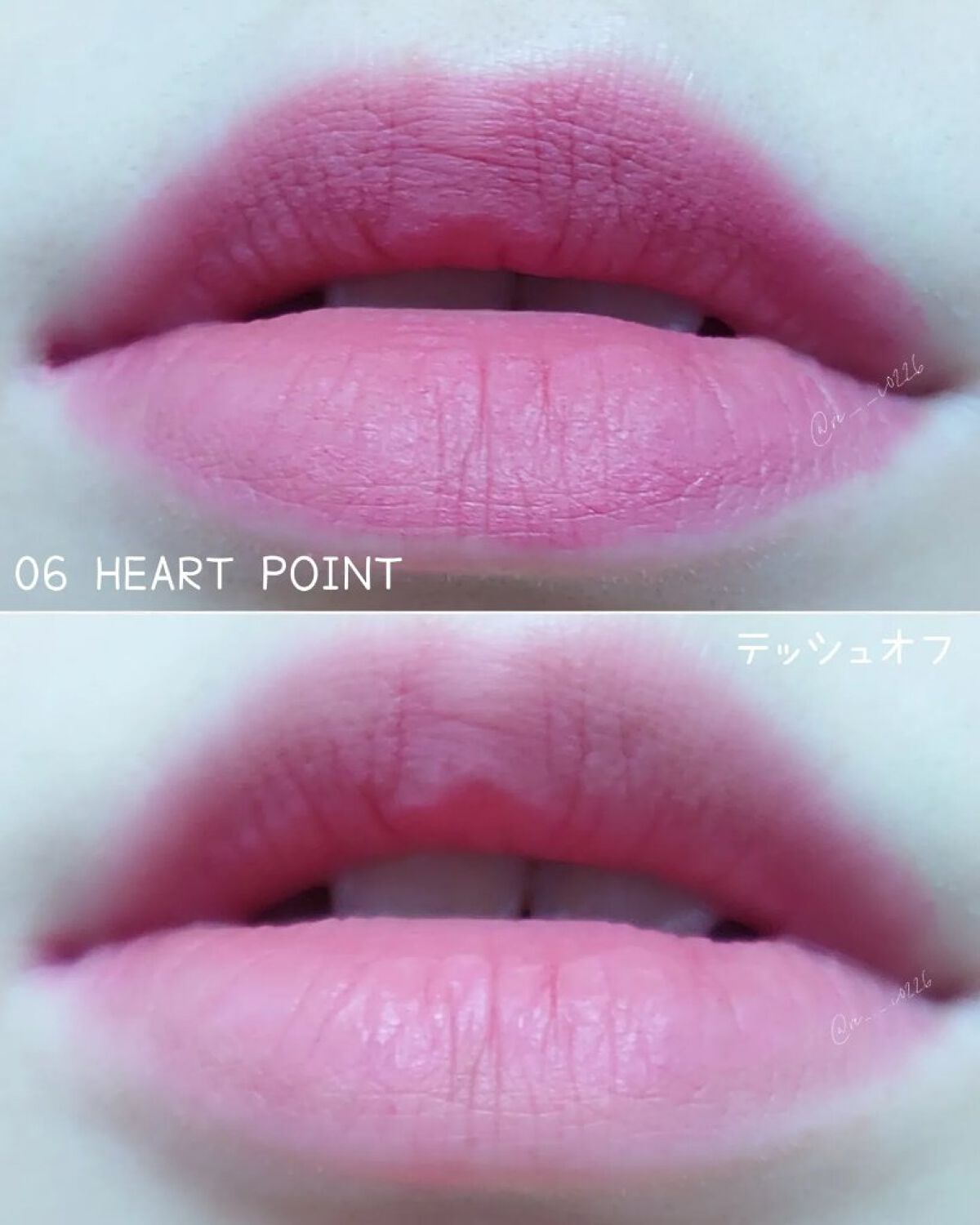 アプリケーターが細く細部まで塗りやすい💄 滑らかでふわっとした塗り心地。 01のピーチべべはコーラルピンクの様な色味💛 06は深みのあるプラムピンク💜 どちらもクールトーンの方にオススメ😉 確かに重ねると独特の色味になり深みが増して更に可愛い😍💕 ティントとありますが、持ちはまずまず🤔 マットですが、乾燥もに気になりませんでした✨ 発色が良いので、テッシュオフした方が自然に馴染んで好きかも😘💋