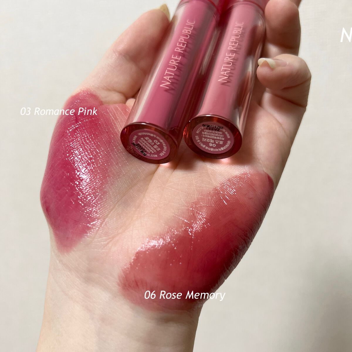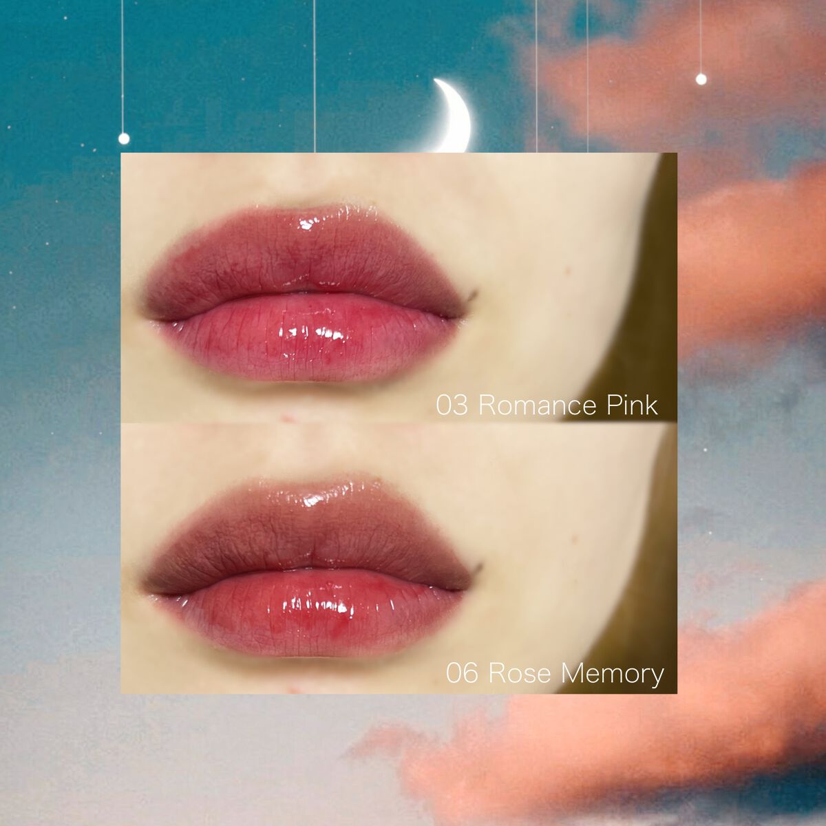ベタつかない、フルーツ飴のようなグラスリップ🍬♡ つけたままの色がリップに密着しティント本来のカラーがそのまま持続! 全8色でかなり高発色なザ、ティントな色展開! 本当にフルーツ飴のような発色の少し重ための(今流行ってるティントと比べると)ティント🍑 唇が荒れてる時はそこだけしっかり染まって不格好になるタイプのやつ。 香りは甘くフルーティーな香り。わたしは好きな香りでした〜! 03 Romance Pinkは恋に落ちたようなピュアピンク💖 06 Rose Memoryは記憶に残るビンテージローズ🌹 どちらも私の唇では暗め、ダークめな発色でそれも好きな感じだった🙉 1190円でかなりお安いし、カラー展開もたっぷりなのでぜひチェックしてみてください♡