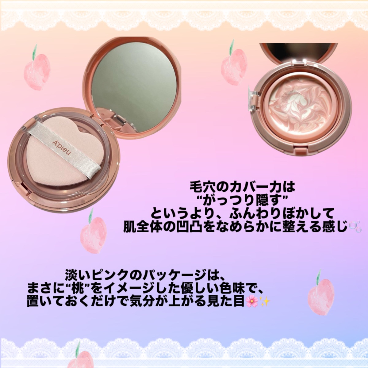 ハートのパフも可愛いんです🫰 先端部分が小回りきいて使いやすいです( ¨̮ ) 替えのパフも売ってるみたいで、とっても欲しい! こちらはすべらせて使います! ペリペリ剥がすと、か、かわいい〜!🥹 もったいない😭と泣きながら使い始めました パフから中身からもう全てが可愛い、、 夏で柔らかくなってて、少なめにとったつもりでもたくさんついちゃいます! 少ない量で伸びるので、とりすぎ注意です⚠︎︎ 完成するとツヤっとしたベースが仕上がります😌 保湿系の下地で、パウダーを塗ってもツヤ感はそのまま トーンアップ効果はそこそこです🐼 昼寝(夕寝)しても崩れてなかった!!