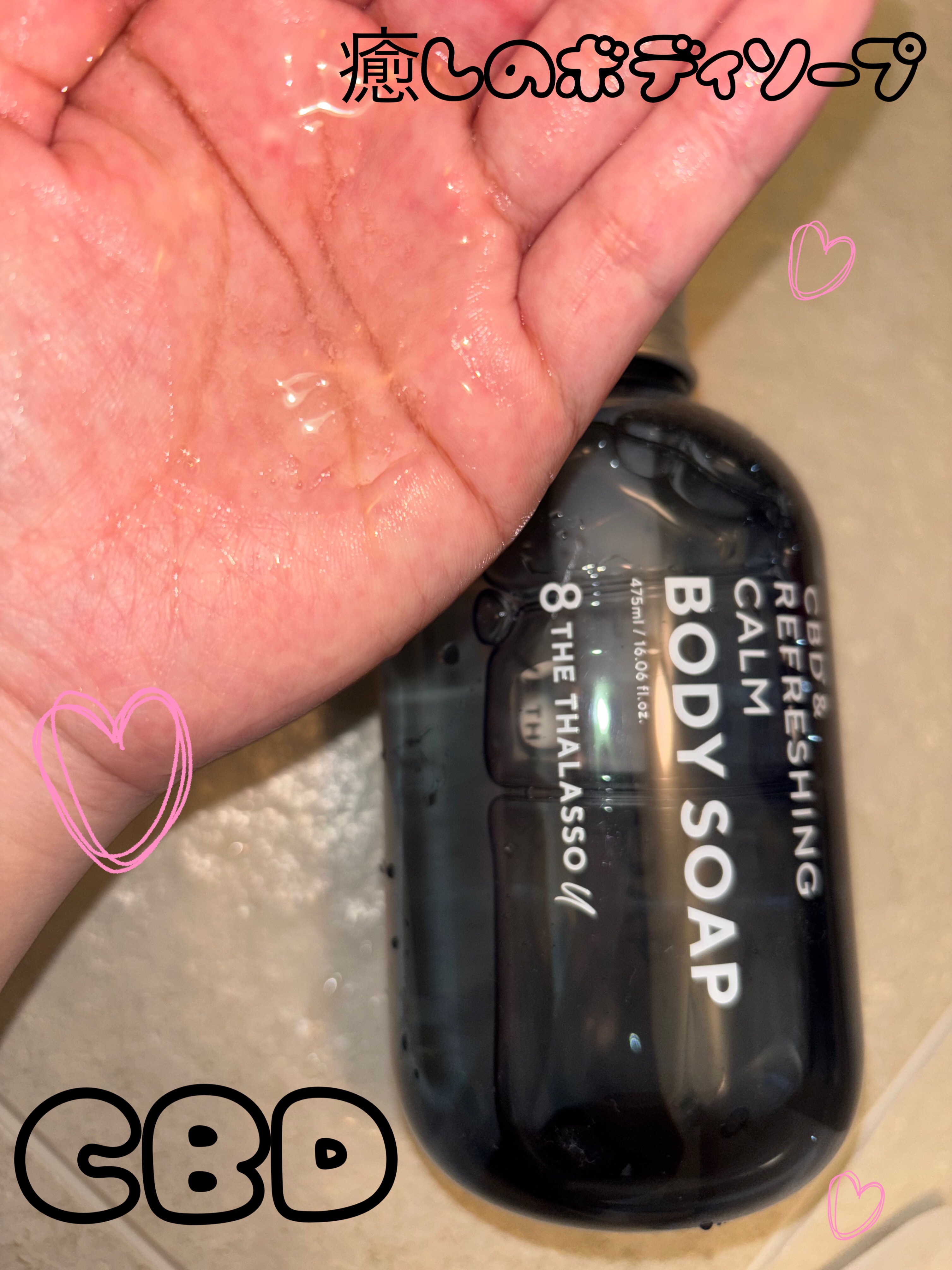 ✴︎エイトザタラソユーCBD&リフレッシングカーム美容液ボディソープ✴︎洗浄力が優しく、泡立ちがとても良くふわふわのたっぷりの泡で摩擦を気にせず洗えるし、天然クレイ配合の液体ボディソープで、余分な皮脂や汚れを吸着してくれて洗い流した後は肌の乾燥や、つっぱり感がないのにツルツルになっていてとてもスッキリ感があって気持ちいい(^^)保湿成分も配合されてるから、カサカサにならないししっとりしていて、美容液で洗ったんじゃないかと思ってしまうほどで、感動です🥺❣️