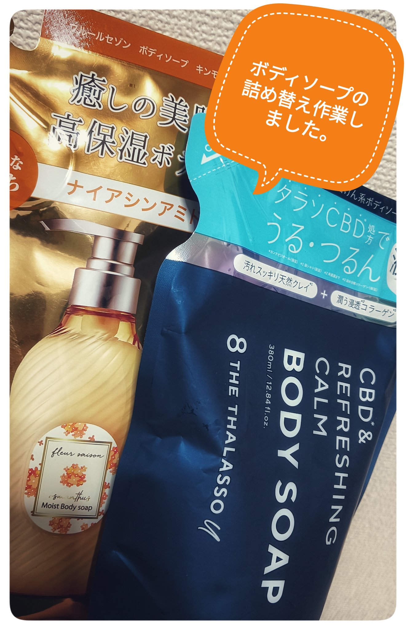 #エイトザタラソ#エイトザタラソユーCBD&リフレッシングカーム美容液ボディソープ#フルールセゾンボディソープキンモクセイの香り今から詰め替え作業します、、、エイトザタラソのボディソープはリピートし続けていて、、、買う前にストックもなくなり我慢していたしたwさっきお風呂入ったんですが、、、香りも、泡立ちもよくてお気に入り。フルールセゾンのボディソープはまだつかったことがないので、楽しみですっ金木犀とみちゃうと、試したくなります😆まず作業してきます☺️