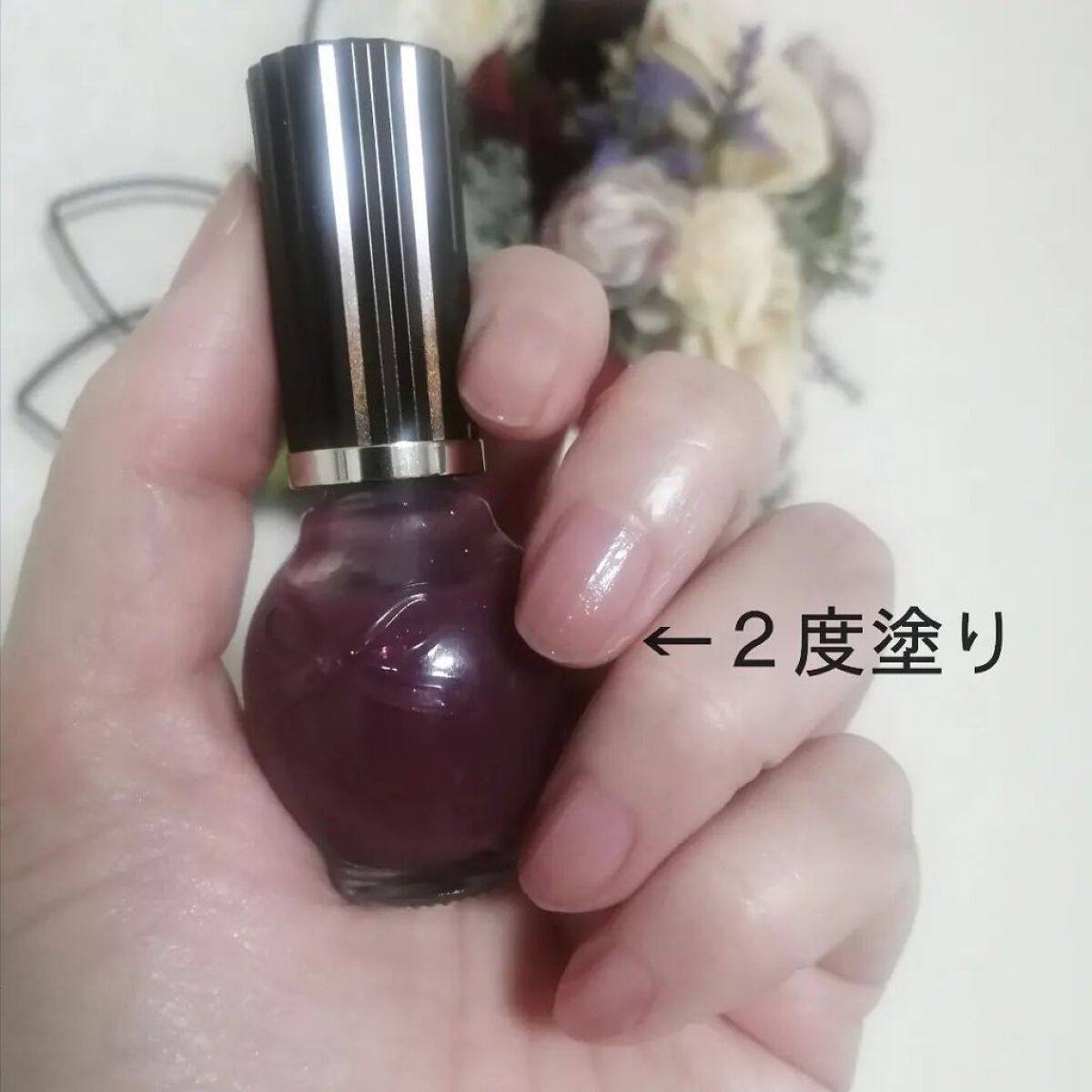 肌馴染み良い優しい青みピンクで使いやすい! オフィスにもいけそうな上品な色 1本でツヤツヤになりトップコートいらず 1度塗り ほんのり血色+ツヤ感が出て ナチュラルな仕上がり 2度塗り 発色良くしっかりピンクになりかわいい! 個人的にはこれが一番好きな仕上がり 3度塗り 2度塗りよりも若干くすみ深みがでるかな?