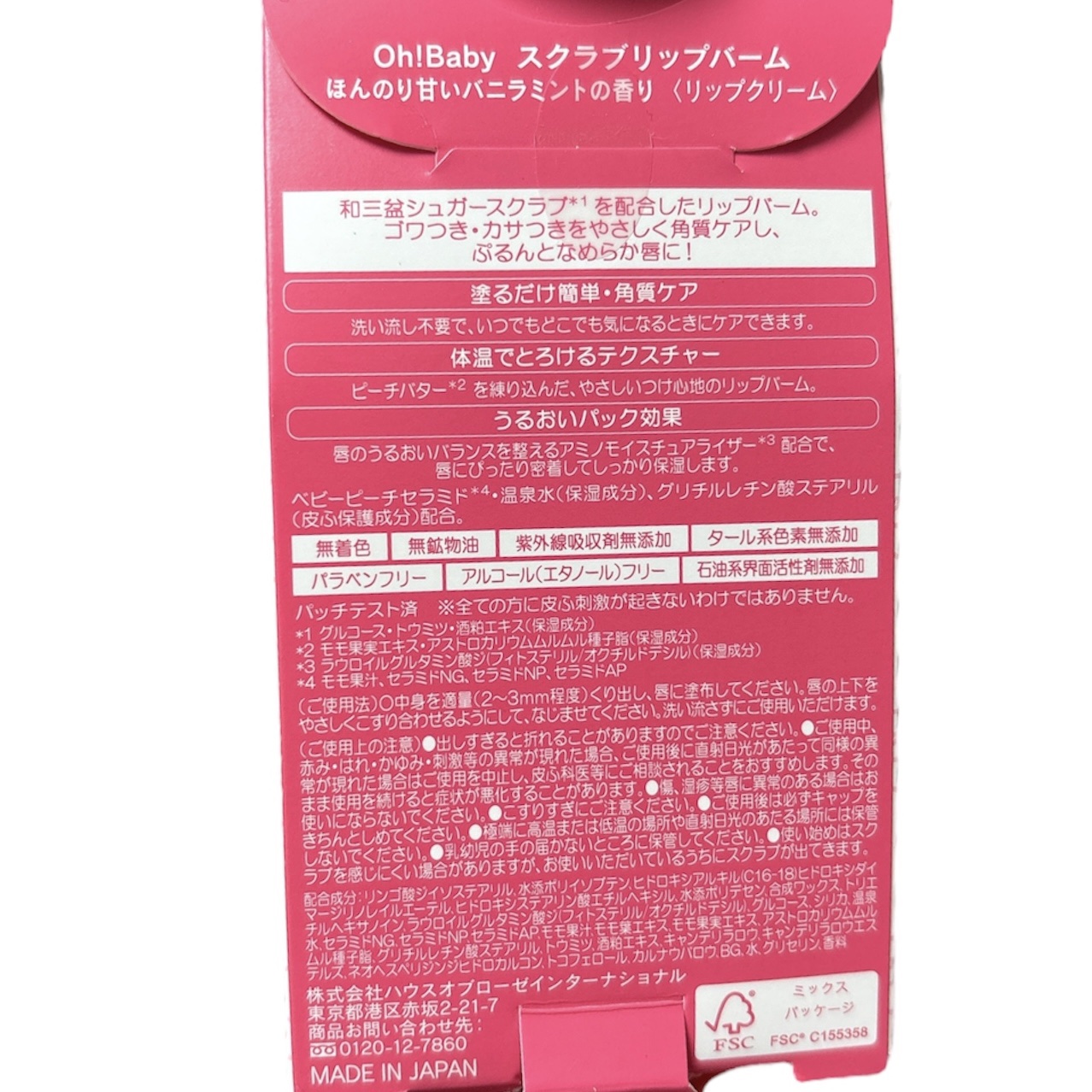 Oh!Baby スクラブリップは 思っていた以上に良かった! 斜めカットで塗りやすいし、しっとり✨ このスクラブは 和三盆のシュガーなんだって! 温泉水や桃果実エキスが配合されてたり、 ムルムルバターを使っていたり。 香りはバニラミントなんだけど、そんなに強く香らないし気にならない感じ。 リップケア難民なんだけど、なんとなく 良いかなと思ってポチッたのが自分に合って嬉しい♡